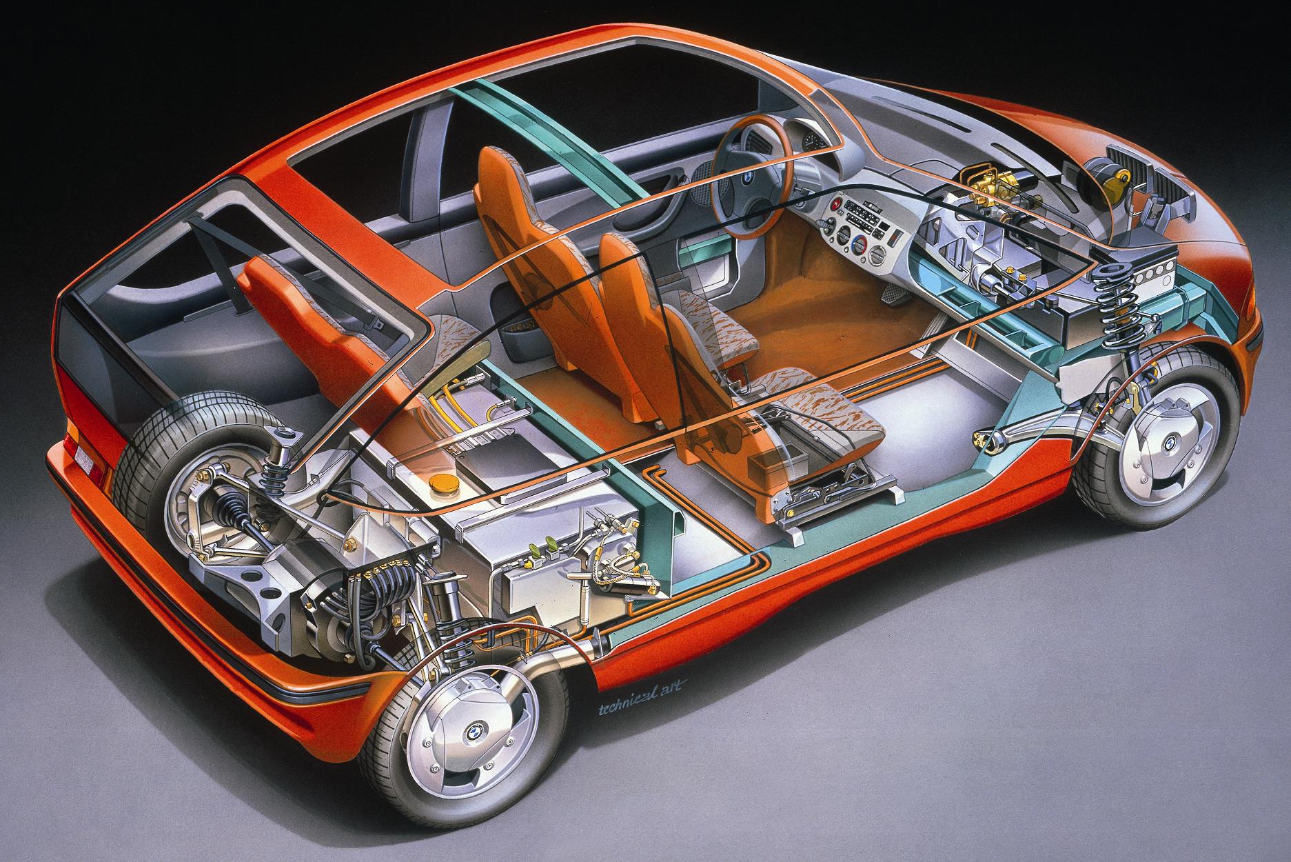 Seine Fortsetzung erfuhr dieser Weg 1991 mit der Studie BMW E1, die ein vollwertiges Fahrzeug für vier Personen mit Elektroantrieb darstellte. Auch bei diesem Modell war Leichtbau einer der zentralen Wegpunkte zu mehr Effizienz und mehr Dynamik gleichermaßen.