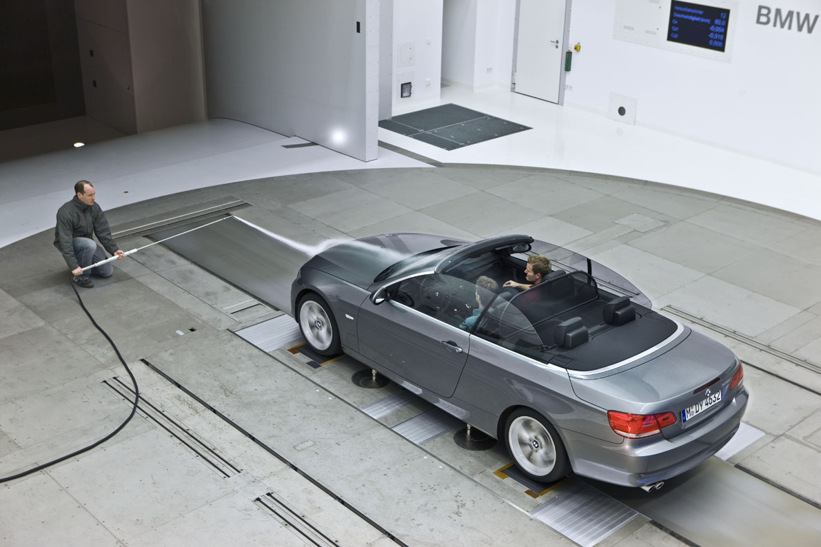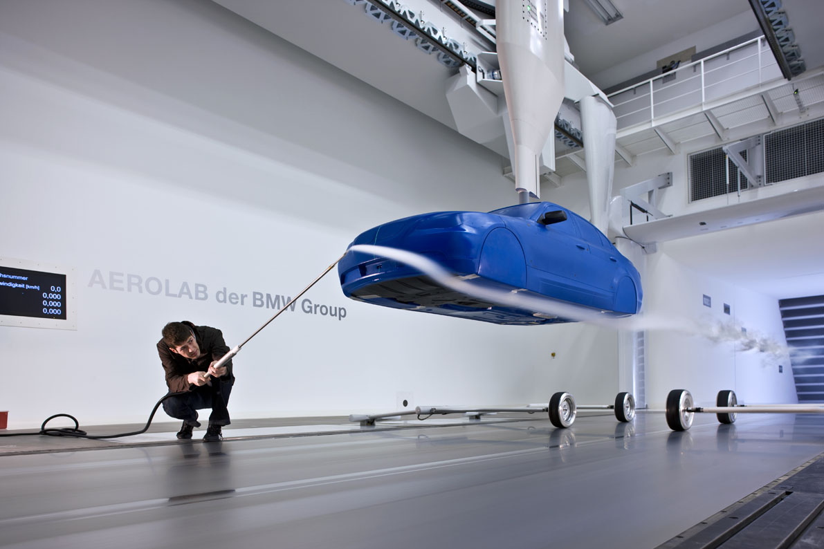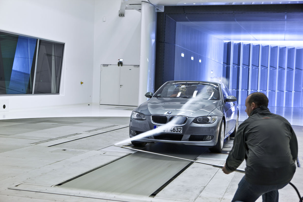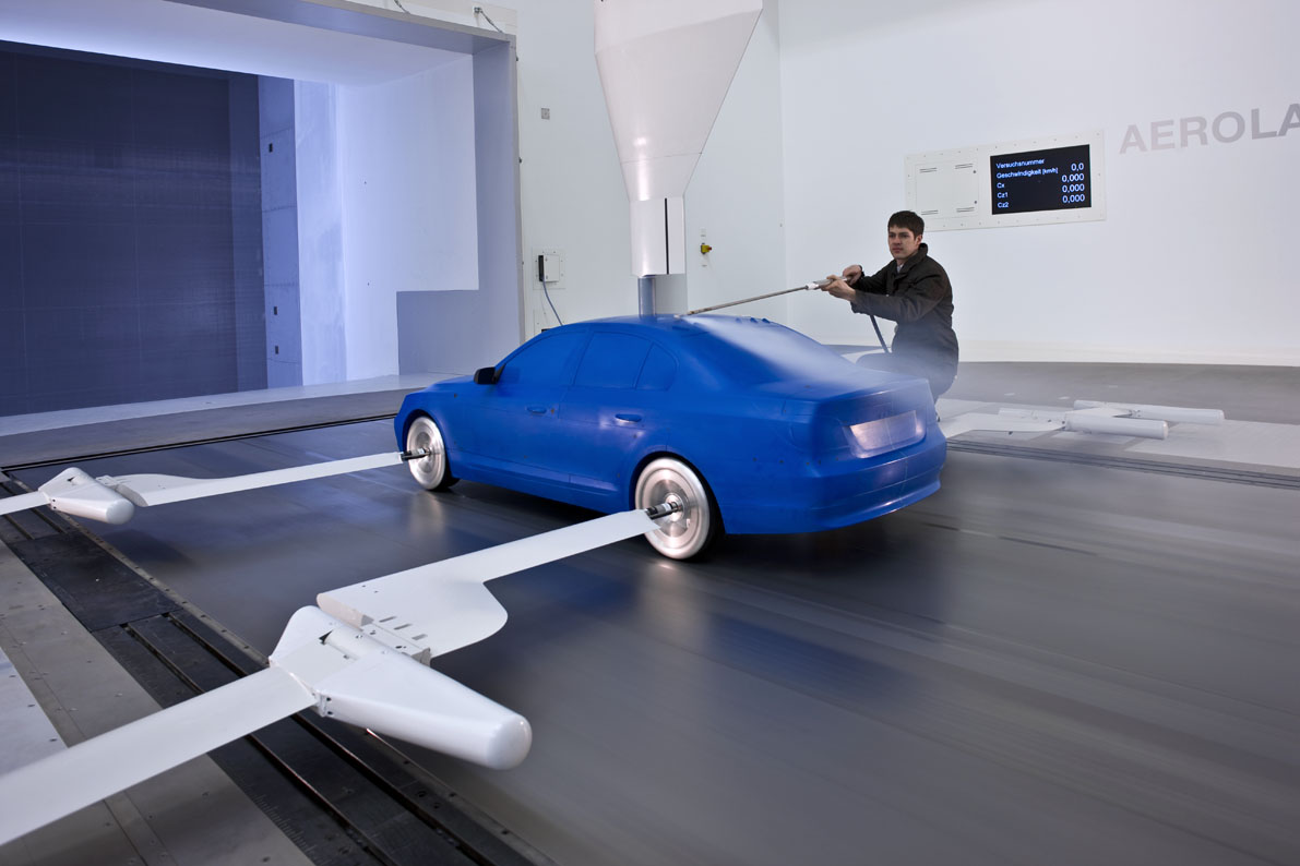 Besonders wichtig ist aber auch, dass der Windkanal die Gegebenheiten der Straße möglichst realistisch darstellen kann. Denn es macht im Windkanal große Unterschiede, ob man das Fahrzeug auf einem Laufband rollen lässt oder ob es nur auf dem Fleck steht. Vor allem die Verwirbelungen an den Radhäusern und am Unterboden unterscheiden sich stark, wenn sich die Reifen tatsächlich drehen oder nur still stehen.