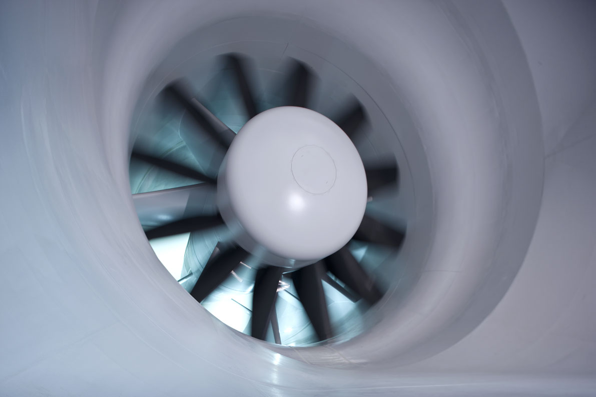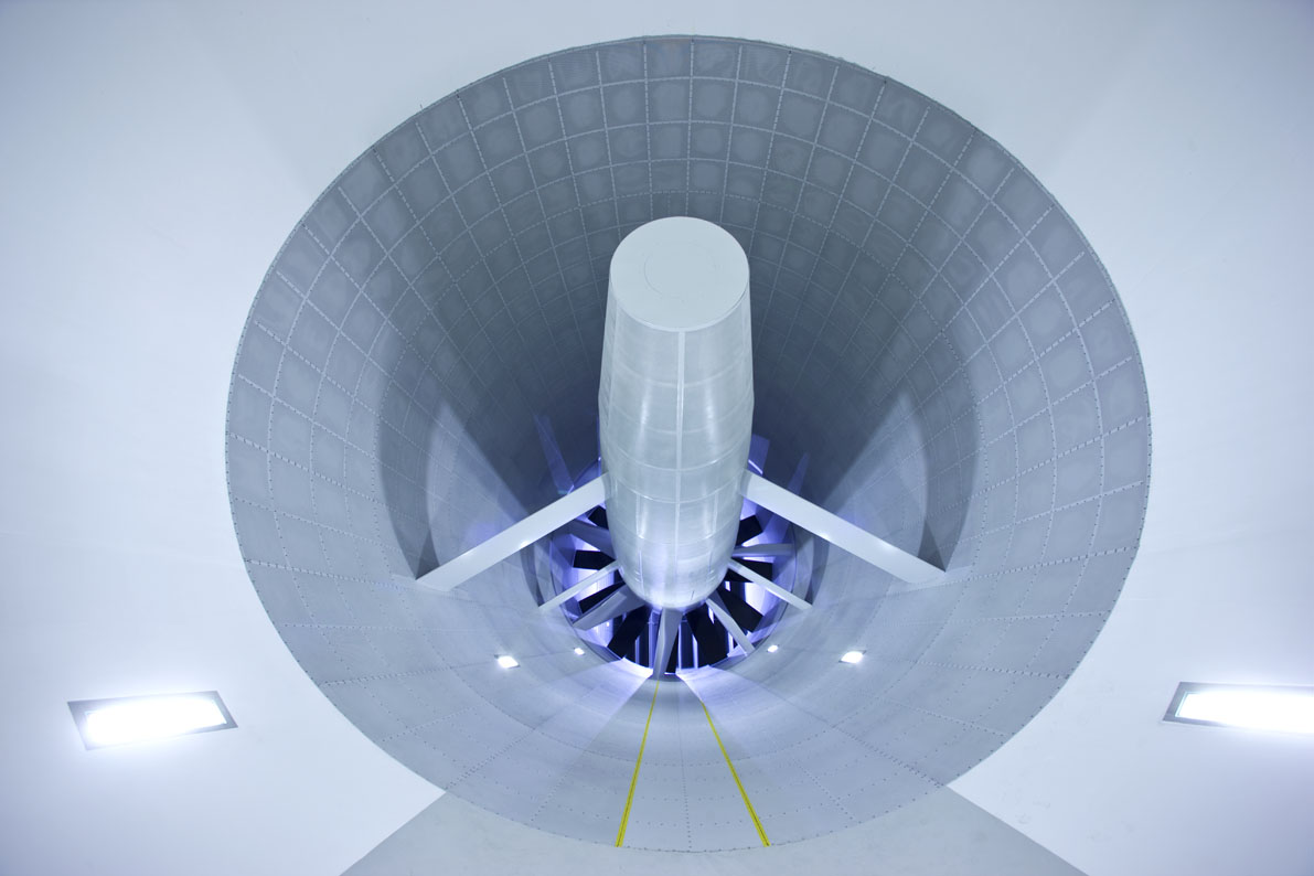 Der große Windkanal des AVZ bietet dafür hervorragende Bedingungen. Der Luftstrom wird dabei von einem Gebläse mit acht Metern Durchmesser auf die gewünschte Geschwindigkeit beschleunigt um dann nach zweifacher Umlenkung auf das Fahrzeug zu treffen.