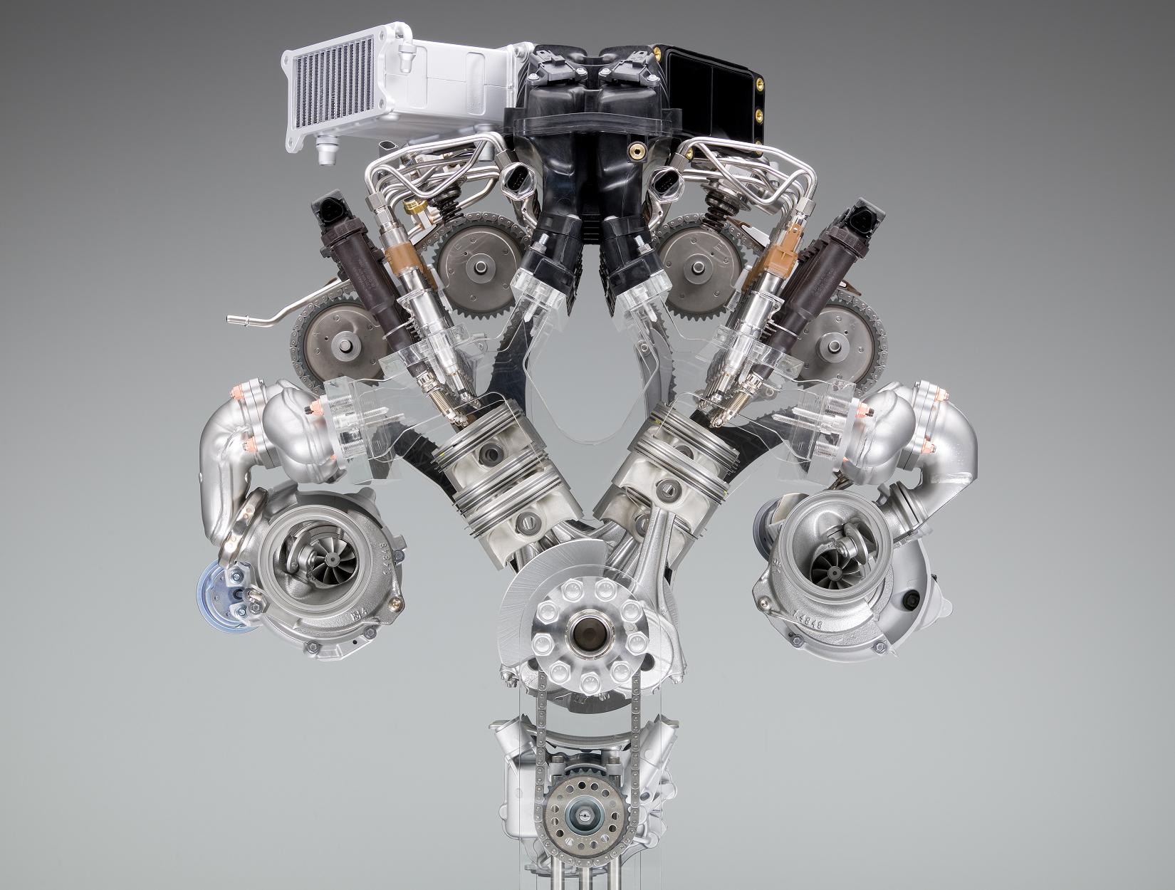 Im Gegensatz zur Anordnung beim V8-Biturbo liegen die Turbolader nicht im Inneren des V, sondern sind gewissermaßen unterhalb der Zylinderbänke an der Außenseite des Motors angebracht. Das ist bei folgendem Bild gut erkennbar: