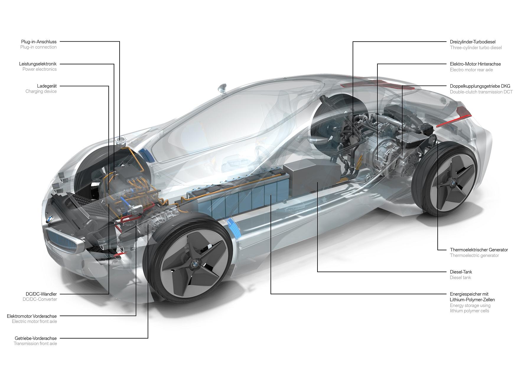 Das BMW Vision EfficientDynamics Concept Car kann die drei Motoren auf jede denkbar Art miteinander kombinieren. Sowohl ein rein-elektrischer Betrieb als auch ein reiner Diesel-Betrieb sind möglich. Dazu kommt natürlich der eigentliche Normalfall, dann arbeiten sowohl die Elektromotoren als auch der Dieselmotor als Hybrid zusammen.