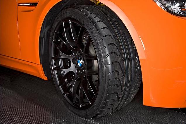 Um die Kraft auch auf die Straße zu bringen, sind an der Hinterachse Reifen im Format 285/30 montiert, die auf mattschwarz lackierten Felgen im 19″-Format sitzen. An der Vorderachse finden ebenfalls üppig dimensionierte 255er Reifen Verwendung. Hinter den schicken Felgen verbirgt sich eine Festsattelbremse mit sechs Kolben und vier Kolben hinten, die den M3 GTS standesgemäß verzögert.