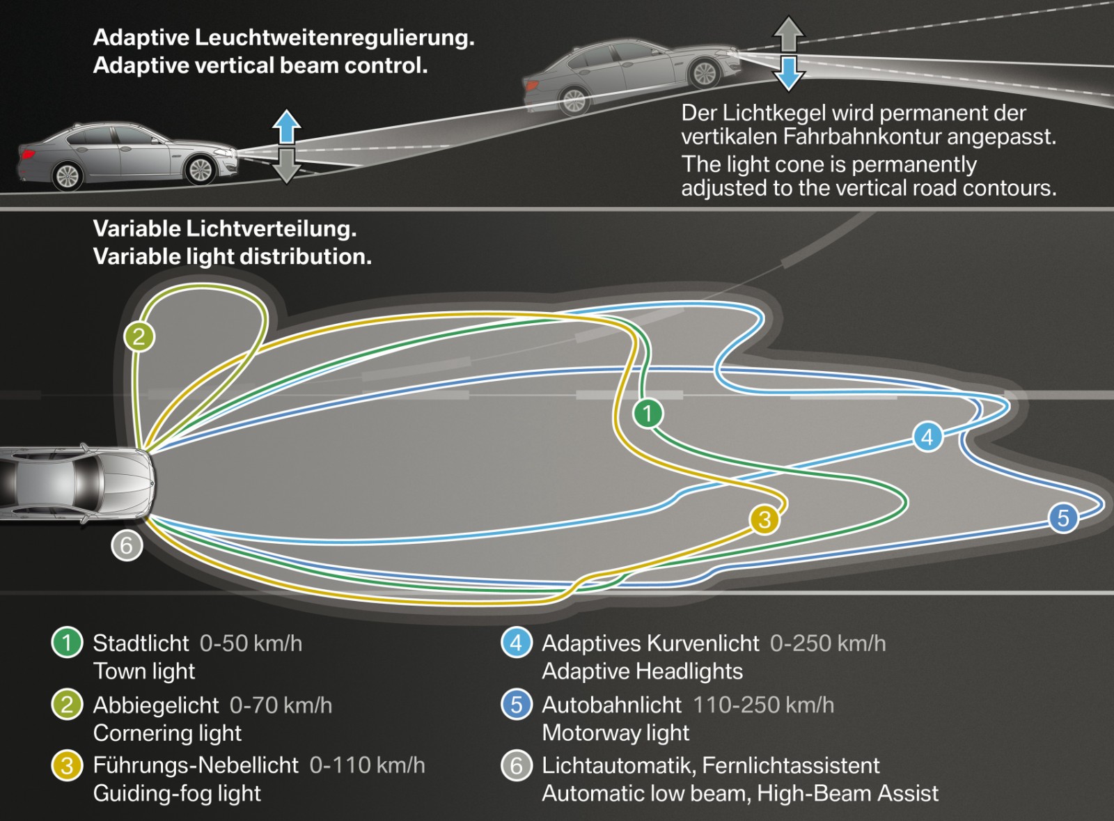 Wie in jedem BMW wurde auch beim neuen 5er großer Wert auf den Faktor Ergonomie gelegt. Alle Displays, Knöpfe und Schalter sind so positioniert, dass sie für Menschen unterschiedlichster Statur und Größe bequem erreichbar sind. Für das Fahren relevante Funktionen wie die Lichtsteuerung sind ausnahmslos über in der Nähe des Lenkrads oder direkt darauf angebrachte Bedienelemente steuerbar und damit im direkten Aktionsradius des Fahrers platziert.