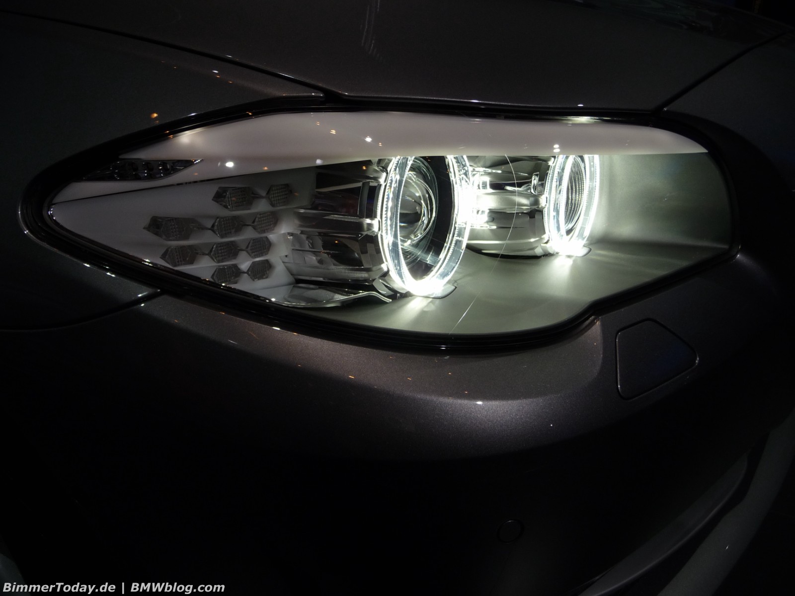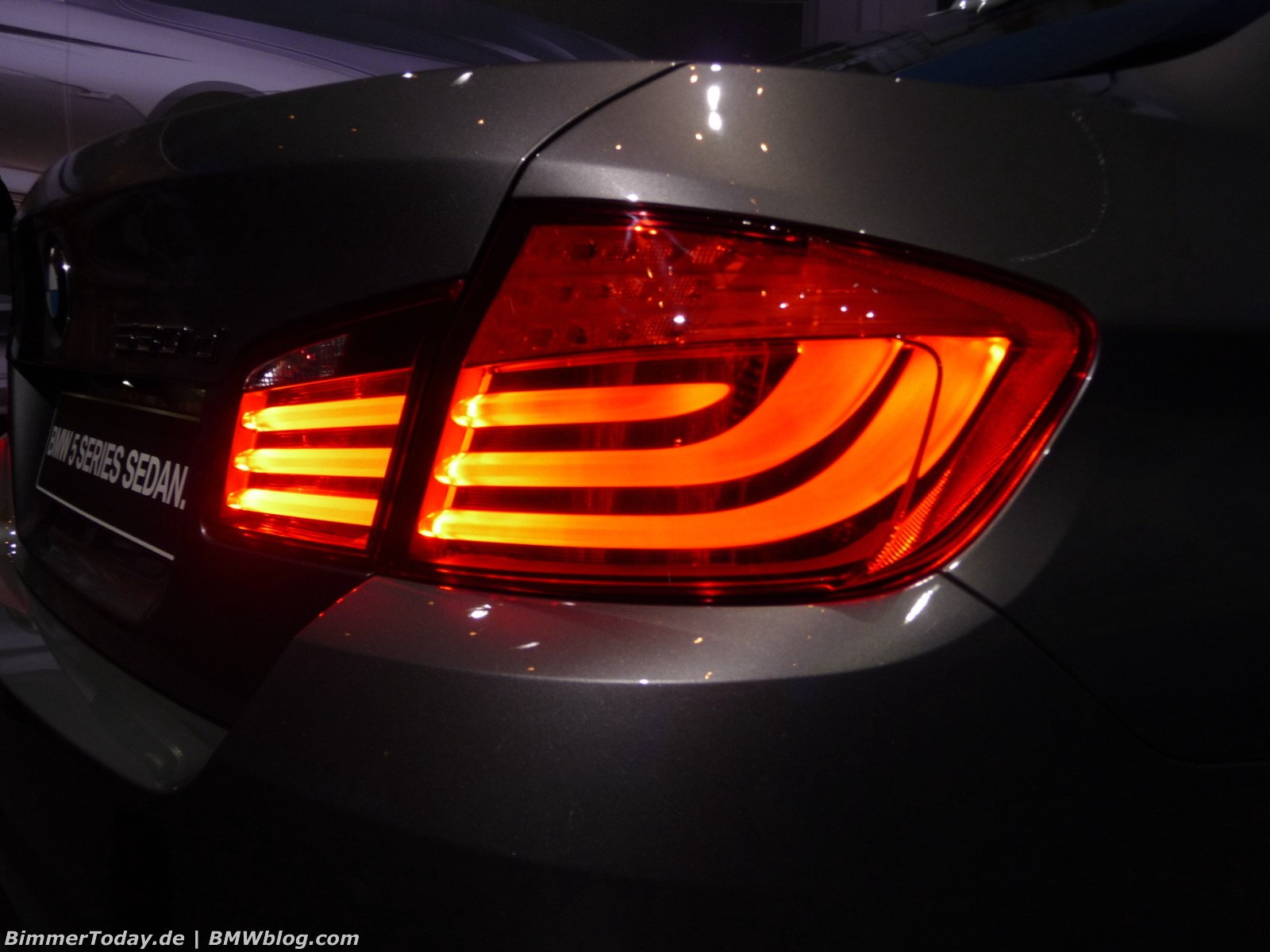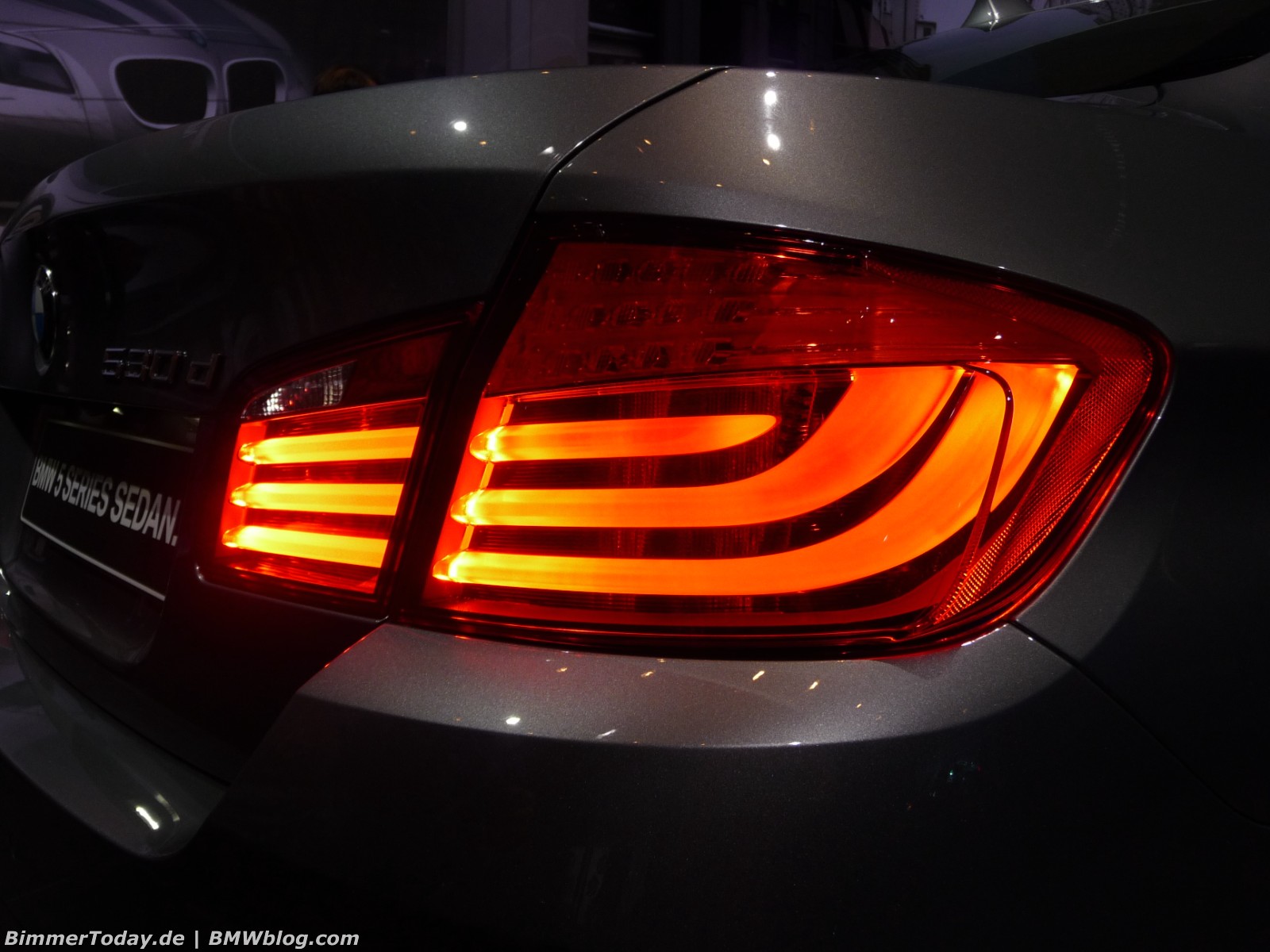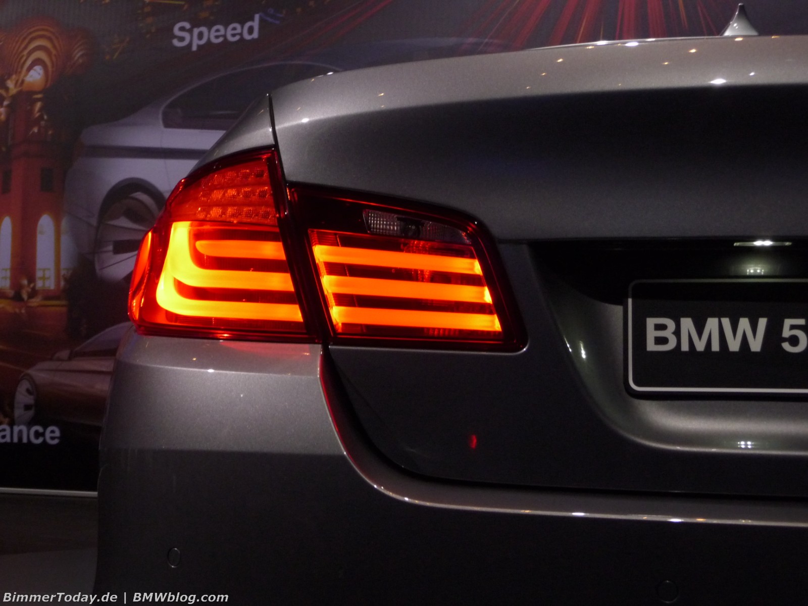 Auf den folgenden Bildern soll es aber zunächst nur um die Lichttechnik der neuen Limousine gehen, zu sehen sind dafür die Front- und Heckleuchten eines BMW 530d. Auffällig sind natürlich die weißen LED-gespeisten Corona-Ringe, die auch als Tagfahrlicht dienen, die LED-Blinker an der Seite sowie die Lichtleitstäbe am Heck.