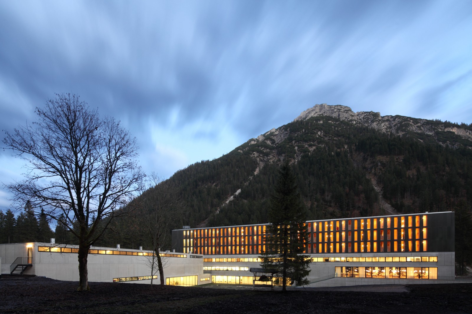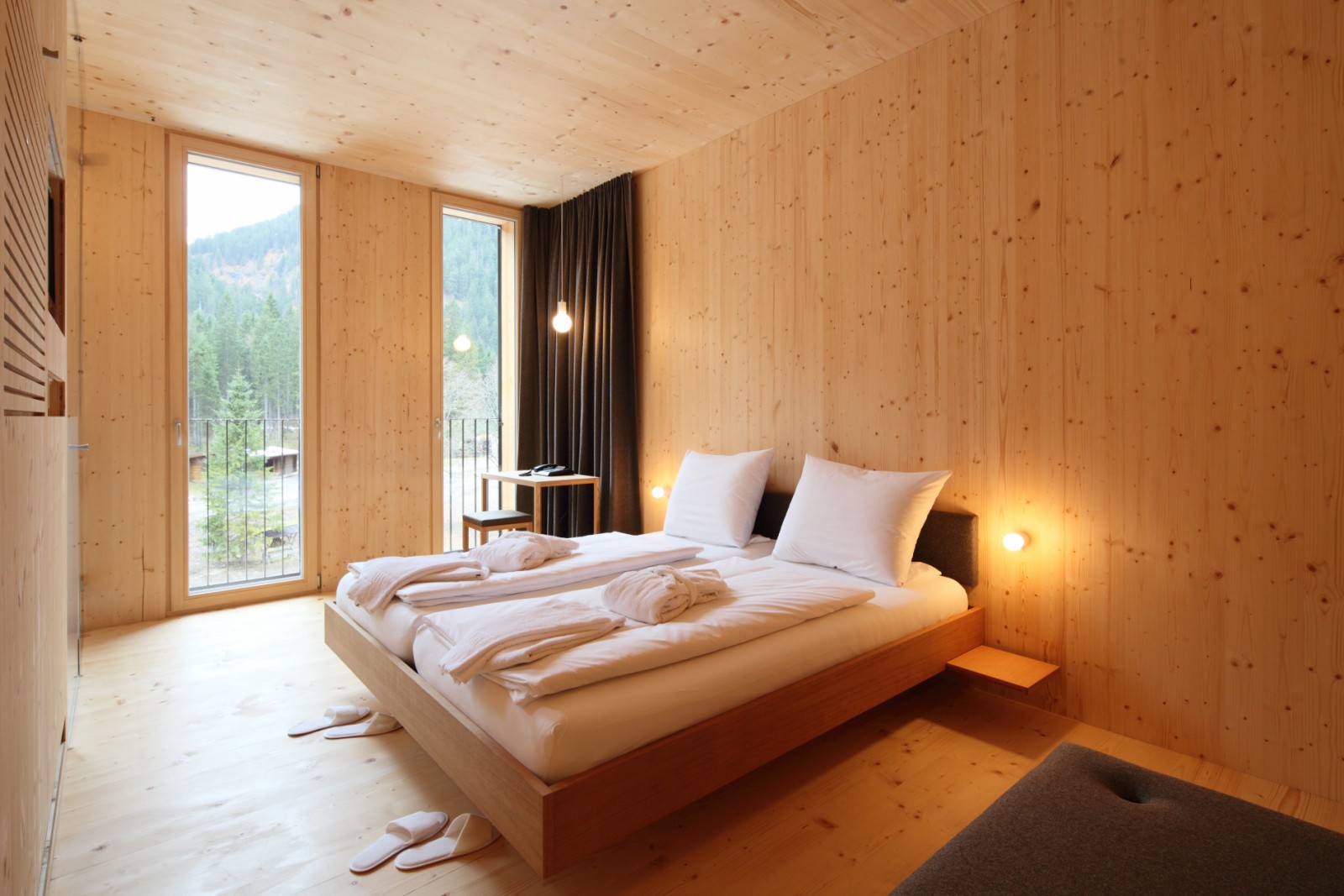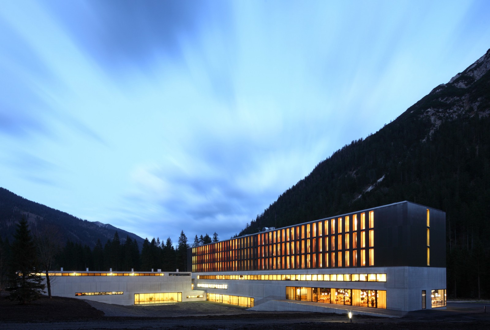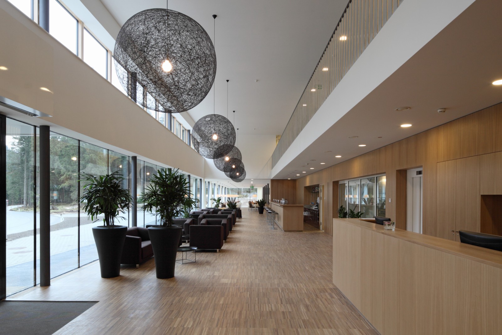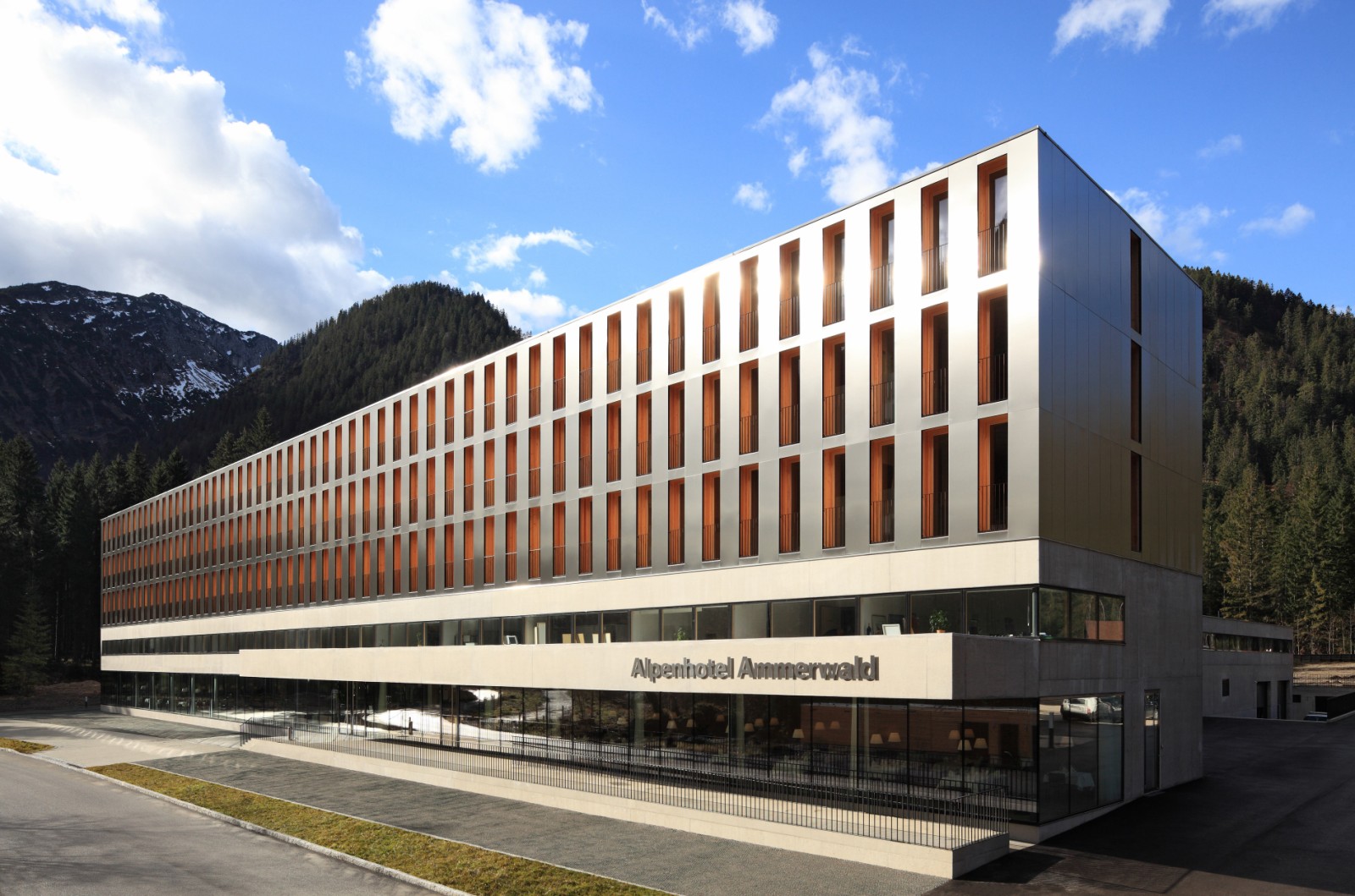 Im ersten Obergeschoss sind Seminarräume mit einer Gesamtgröße von rund 350 Quadratmetern untergebracht, darüber befinden sich die 93 Zimmer des Hotels, die allesamt in Massivholz-Modulbauweise gebaut wurden. Überhaupt bestimmen Glas und einheimische Holzarten die Erscheinung der Räume, die entsprechend lichtdurchflutet ausfallen und den Blick auf das Alpenpanorama freigeben.