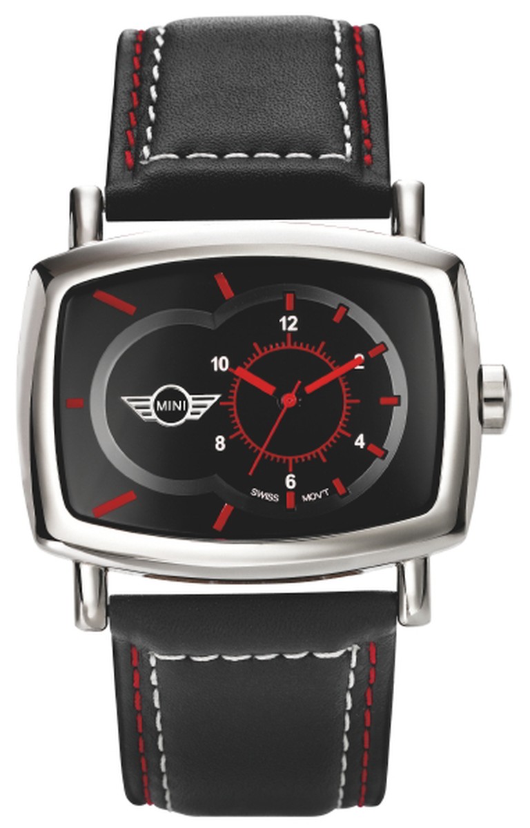 Für Herren gibt es auch eine schicke Armbanduhr im MINI-Design, die Uhr ist aus rostfreiem Edelstahl und verfügt über ein schwarzes Lederarmband. Mehrere Details sind für rote Akzente verantwortlich, über den Ladentisch geht die Uhr für 130€.