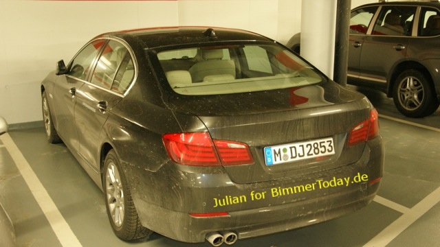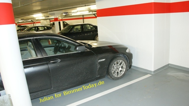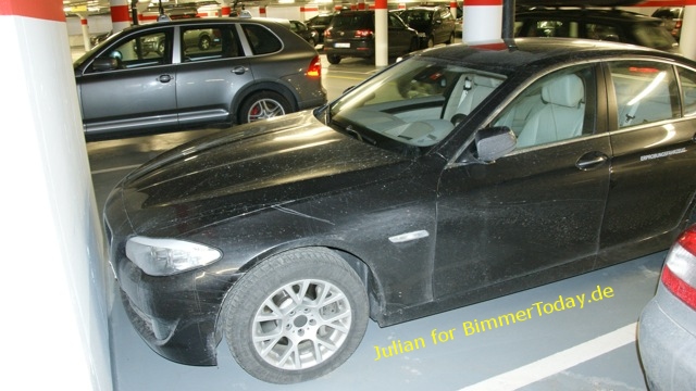 Unser Leser Julian hat in einem Parkhaus in der Schweiz einen BMW 5er F10 gesehen und ein paar Fotos gemacht, die uns die neue Limousine erstmals in Schwarz zeigen. Die Spuren der winterlichen Verschmutzung sind unverkennbar und der Fahrer hat offensichtlich kein Interesse daran, dass das Fahrzeug einen sonderlich gepflegten Eindruck macht. Durch das extrem nahe Parken an der Wand hat er leider erfolgreich verhindert, dass wir ein Foto der Front erhalten haben.