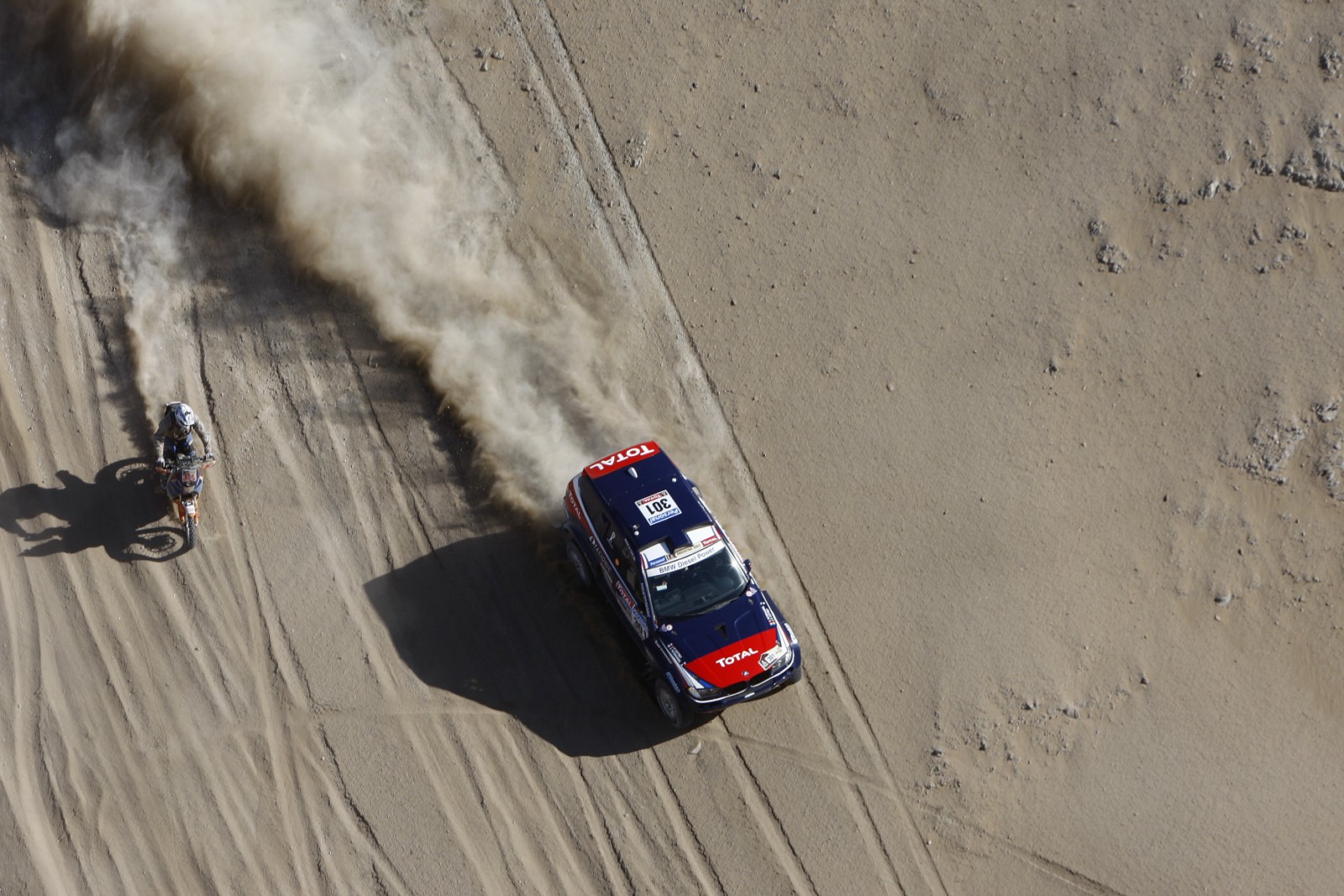 Auf der heutigen Etappe konnte Stéphane Peterhansel mit seinem BMW X3 CC erneut niemand folgen und der Franzose feierte seinen insgesamt 54. Etappensieg bei einer Rallye Dakar, davon waren immerhin 21 auf vier Rädern erfahren. In der Gesamtwertung konnte er heute seinen Teamkollegen Guerlain Chicherit überholen und liegt nun auf Position vier, Chicherit hatte heute Pech mit einem platten Reifen und folgt 22 Minuten dahinter auf dem fünften Platz.