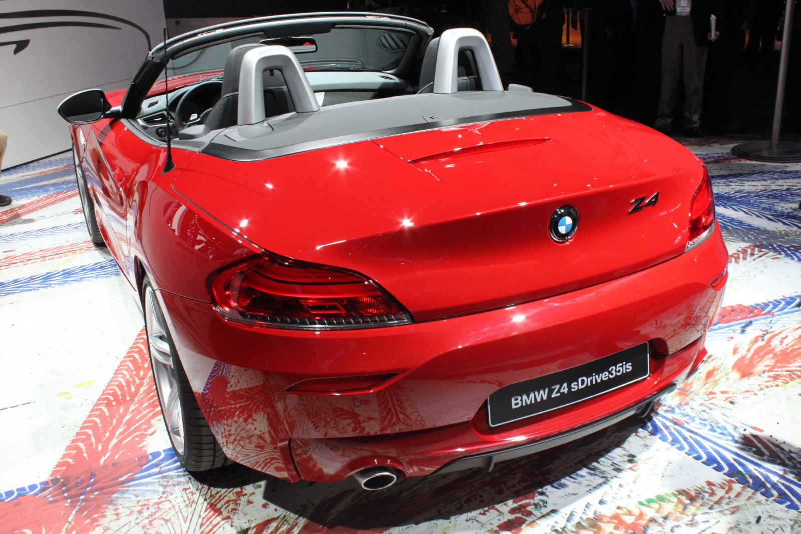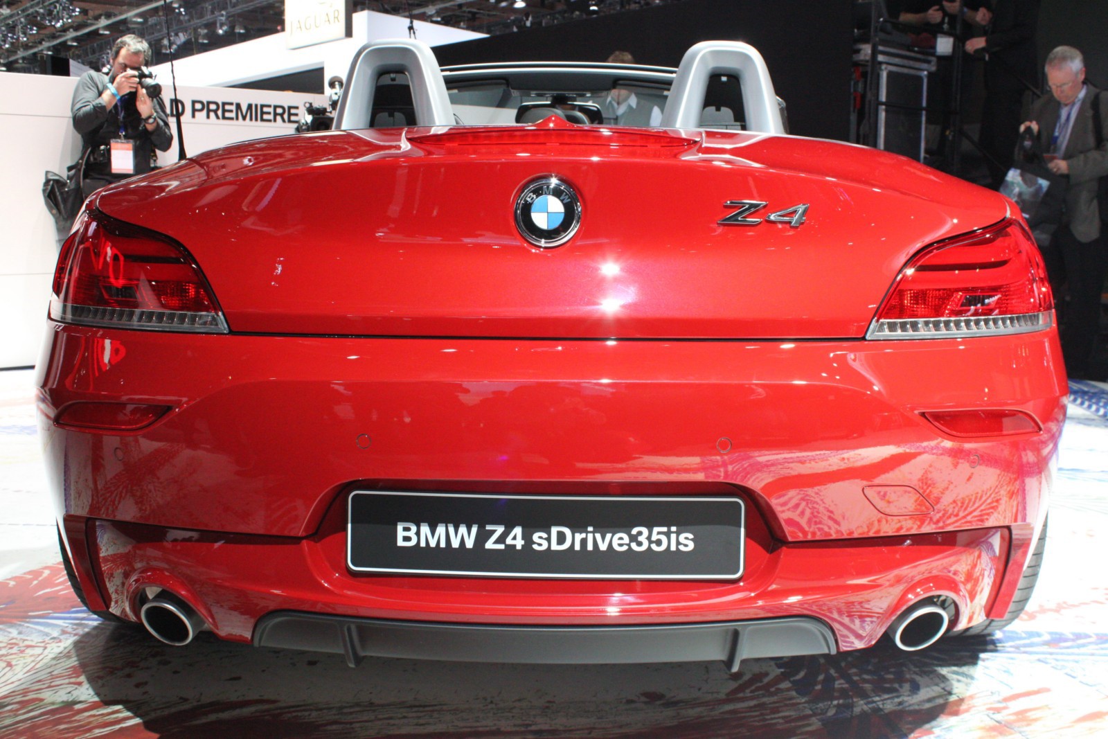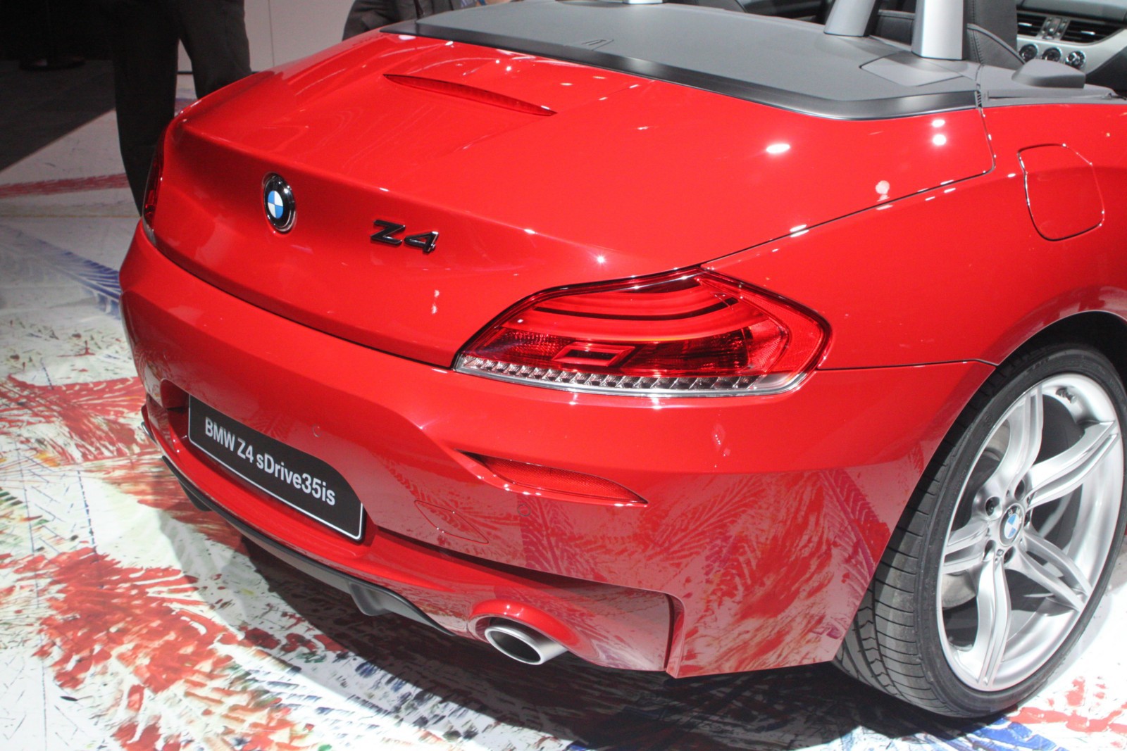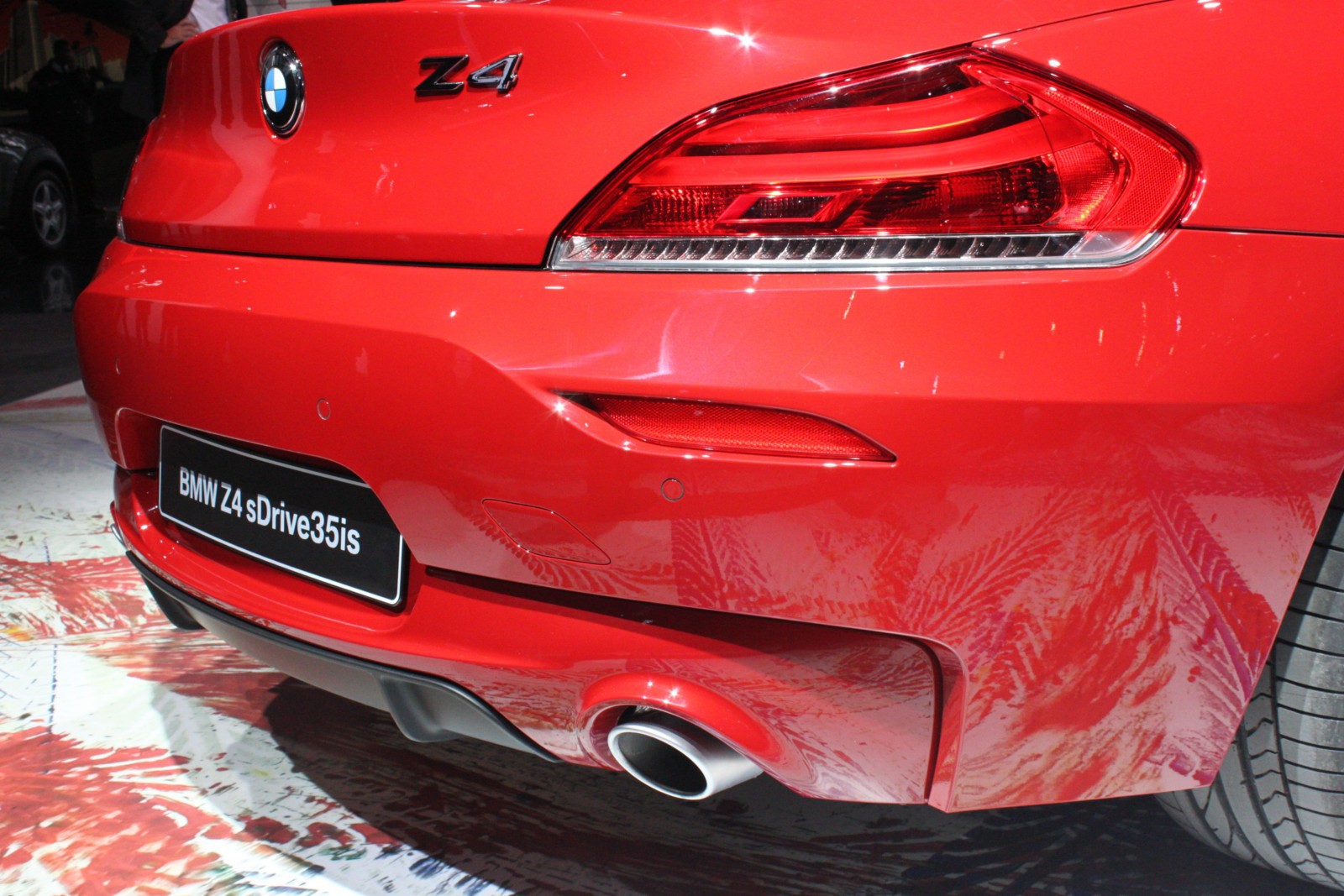 Der in Detroit ausgestellte Z4 E89 ist wie die Pressefahrzeuge in feurigem Rot lackiert und unterstreicht damit den aggressiven Auftritt des Roadsters, der serienmäßig mit dem neuen M Sportpaket ausgestattet ist. Erkennbar ist das Top-Modell an den silbernen Außenspiegeln und den ebenfalls lackierten Längsstreben in den Nieren. Auch an der Heckschürze unterscheidet sich der Z4 sDrive35is von den anderen BMW Z4 mit M Sportpaket, denn der die Endrohre umschließende Diffusor-Einsatz der Heckschürze ist nur beim Topmodell in Wagenfarbe lackiert.
