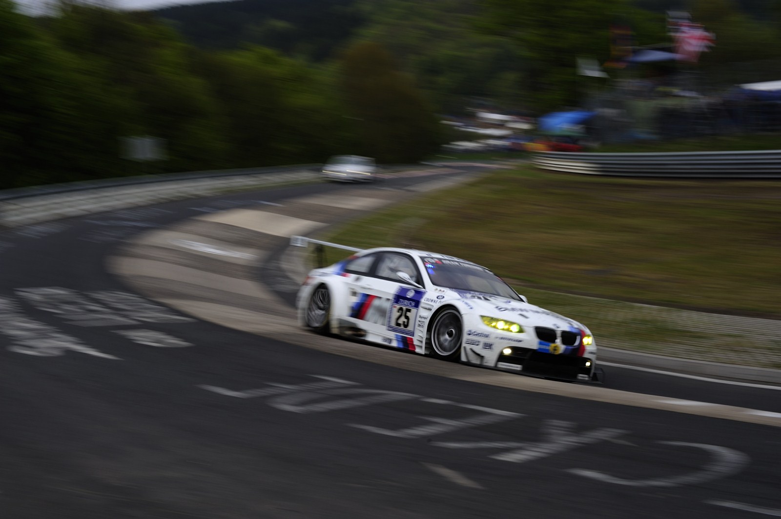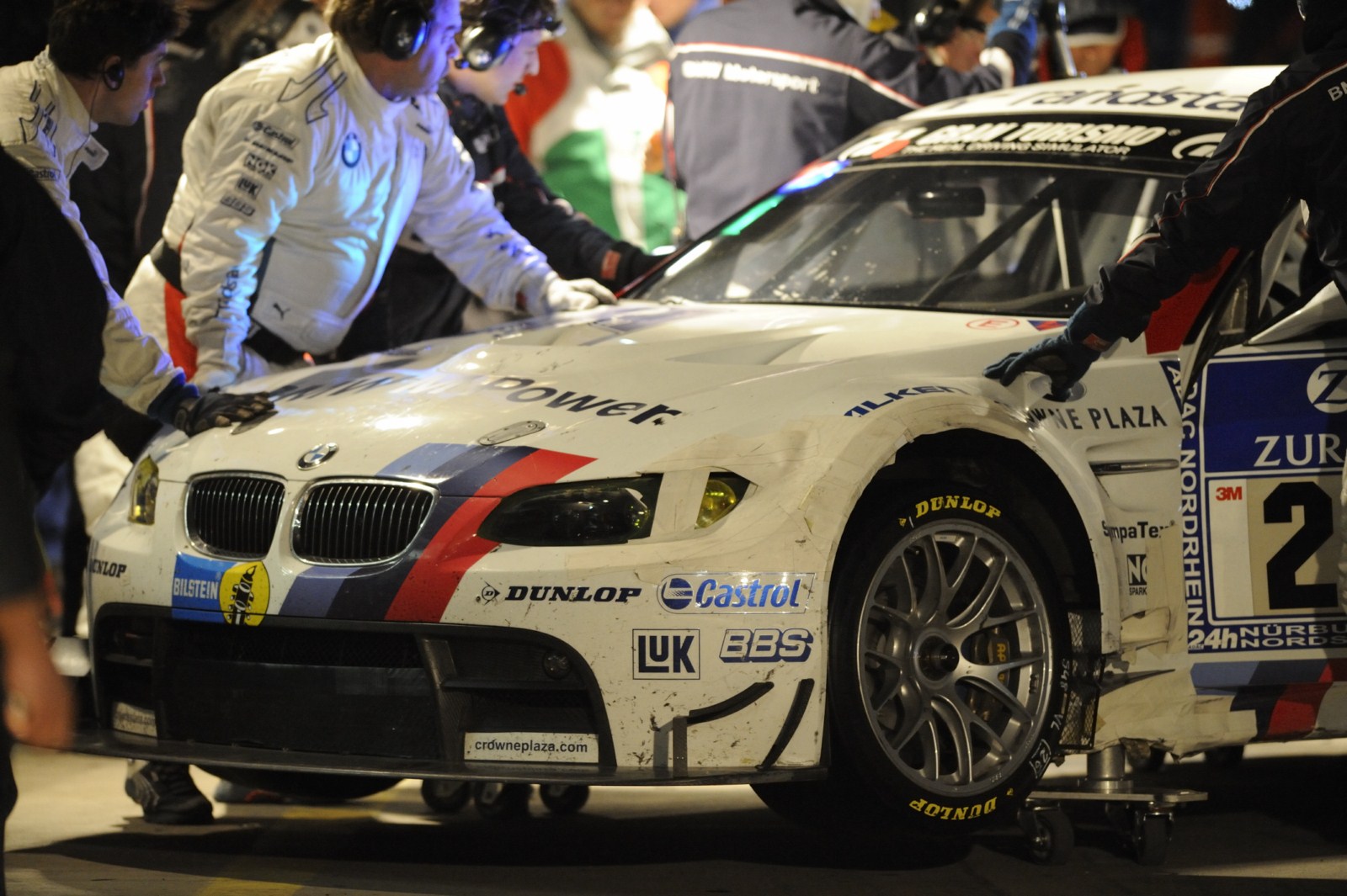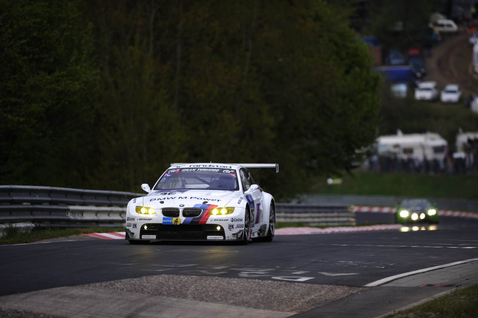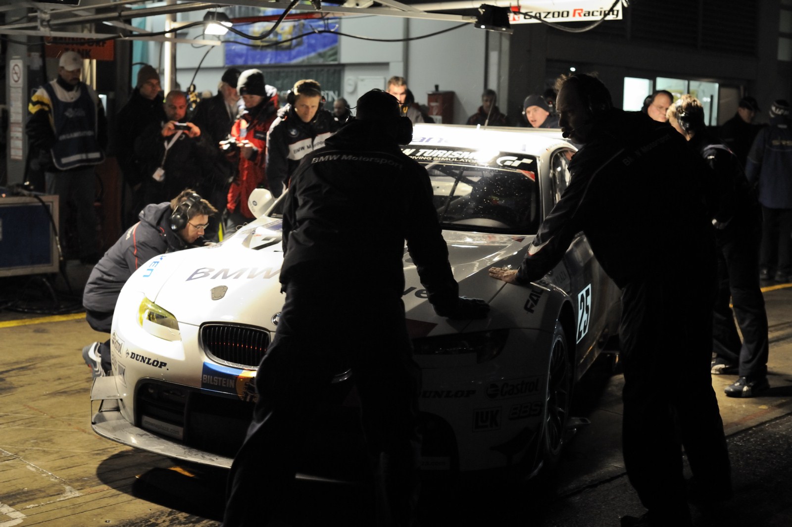 Ohne größere Zwischenfälle verlief die Nacht beim 24-Stunden-Rennen auf dem Nürburgring für die beiden BMW M3 GT2 von BMW Motorsport. Auch wenn es zu Beginn der Nacht kleinere Probleme beim Fahrzeug mit der Startnummer 25 gekommen war und ein kaputter Reifen sowie ein durch einen aufgewirbelten Stein beschädigter Kühler getauscht werden mussten, kann man unterm Strich zufrieden sein. Der Spitzen-BMW fährt momentan meist auf der vierten Position und will nun im zurückgekehrten Tageslicht noch einmal angreifen.