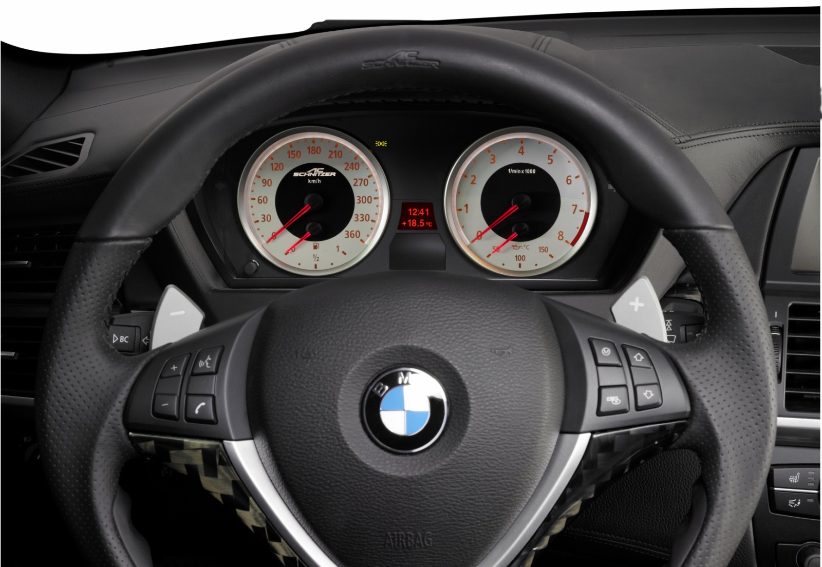 Auch für den Innenraum hat man bei AC Schnitzer einiges im Angebot und bietet beispielsweise ein umgebautes Kombi-Instrument, das nun über weiße Ziffernblätter, rote Zeiger und rote Beleuchtung verfügt. Auch die Tachoanzeige wurde vorsorglich erweitert und reicht nun bis 360 km/h, auch wenn solche Werte sicherlich auch mit der kommenden Leistungssteigerung nicht erreicht werden. Dazu kommen einige Carbon-Elemente für den iDrive-Controller, das Lenkrad und die Zierleisten.