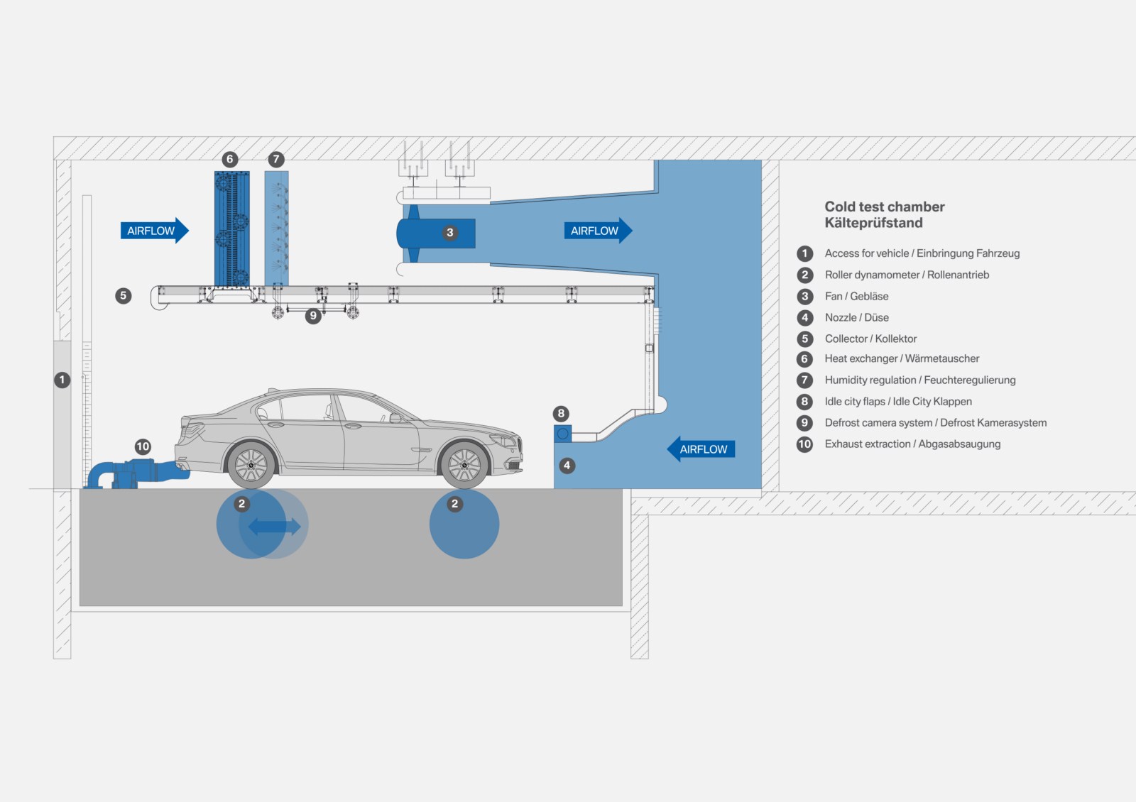 Bei der Fahrzeugentwicklung müssen zahlreiche Faktoren berücksichtigt werden, denn im Laufe eines Autolebens kommen sehr verschiedene Situationen auf ein Auto zu und in keiner dieser Situationen soll ein Premium-Fahrzeug versagen. Um sicherzustellen, dass alle BMWs auch bei extrem kalten Temperaturen wie erwartet funktionieren, besitzt die BMW Group einen Kälteprüfstand, der Bestandteil des Energie- und umwelttechnischen Versuchszentrums EVZ in München ist.