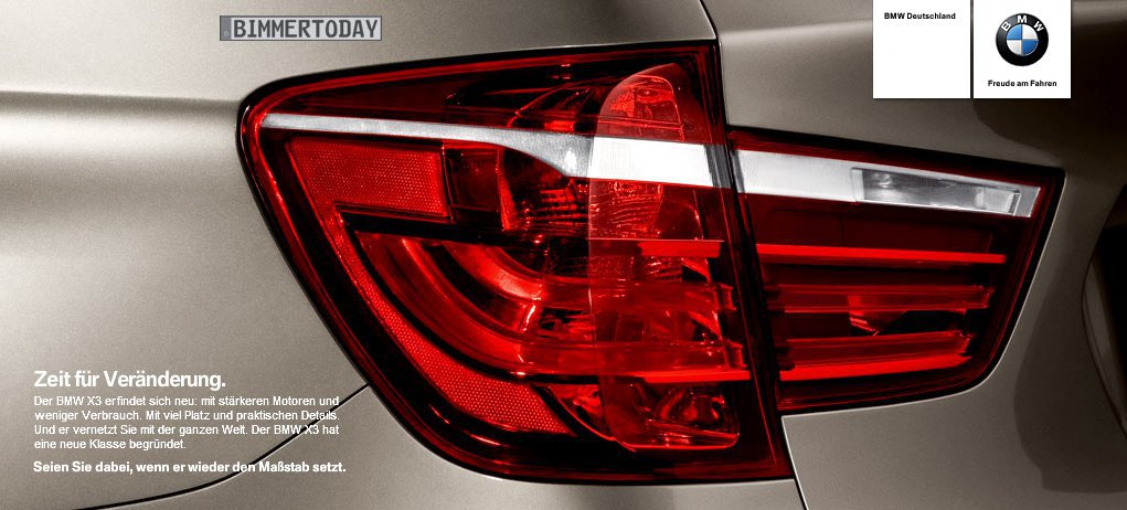 Die Rückleuchten sind klar als Evolution der aktuellen Rückleuchten zu erkennen und machen den X3 auch in der Heckansicht unverwechselbar. Ähnlich wie beim BMW X5 werden die überwiegend roten Leuchteinheiten von einem dünnen weißen Streifen unterbrochen. Natürlich trägt auch der BMW X3 die LED-gespeisten Lichtbalken in den Rückleuchten, die wie bei allen neueren Modellen zur Fahrzeugaußenseite leicht nach oben gebogen sind. Mit offiziellen Bildern rechnen wir in den nächsten Tagen, eventuell wird der Release nach dem Auftauchen dieser Bilder auch ein wenig vorverlegt. Sobald es mehr Infos und mehr Bilder gibt, werden wir natürlich darüber berichten.