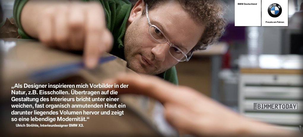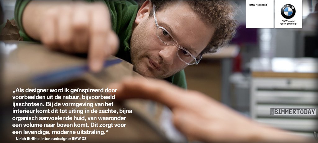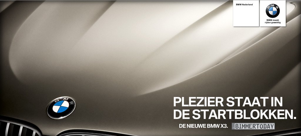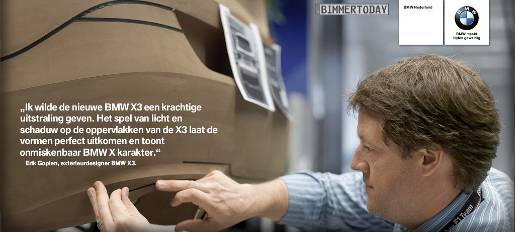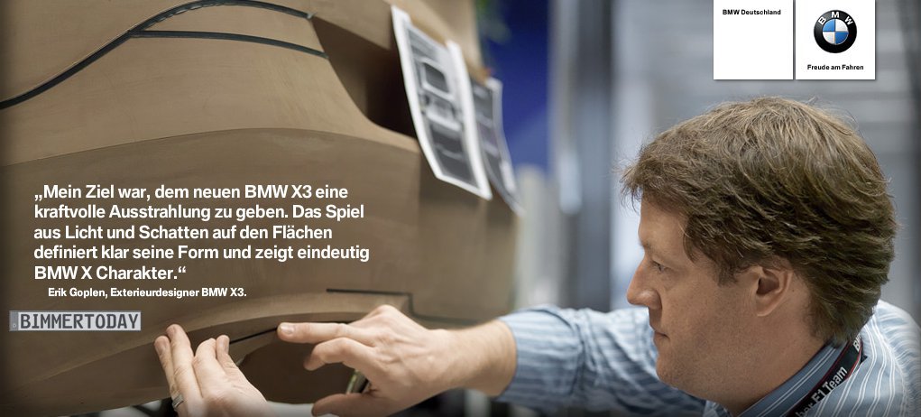 Auf der holländischen Website von BMW, BMW.nl, finden sich erste Detail-Bilder zum neuen BMW X3 F25! Wir sind nicht sicher, ob die Veröffentlichung zu diesem Zeitpunkt bereits beabsichtigt war oder nicht, aber offensichtlich sehen wir die Motorhaube und die Heckleuchten des neuen BMW X3 völlig enttarnt. Dazu kommen Bilder aus dem Design-Entstehungsprozess sowie verkleinerte Bilder vom Übergang der Fahrertür in den vorderen Kotflügel sowie vom Türgriff der hinteren Tür und der leicht ansteigenden unteren Fensterlinie an dieser Stelle. Außerdem ist auf diesem Bild auch eine kräftige Linie erkennbar, die offenbar das hintere Radhaus betonen soll.