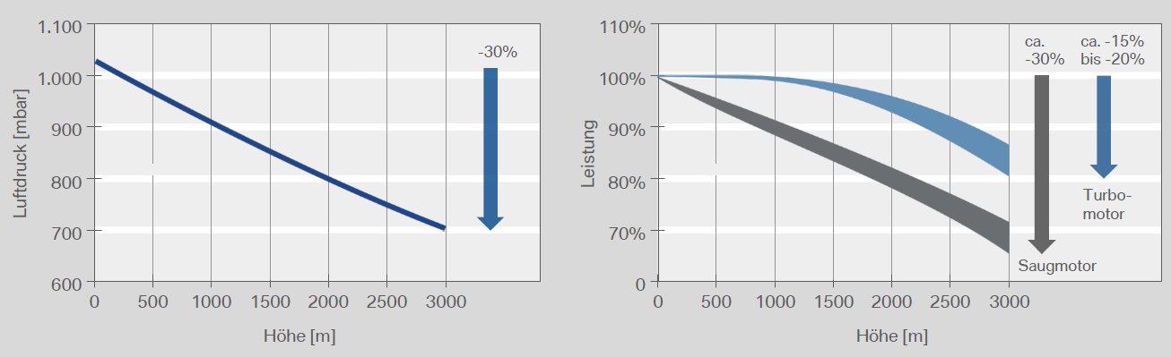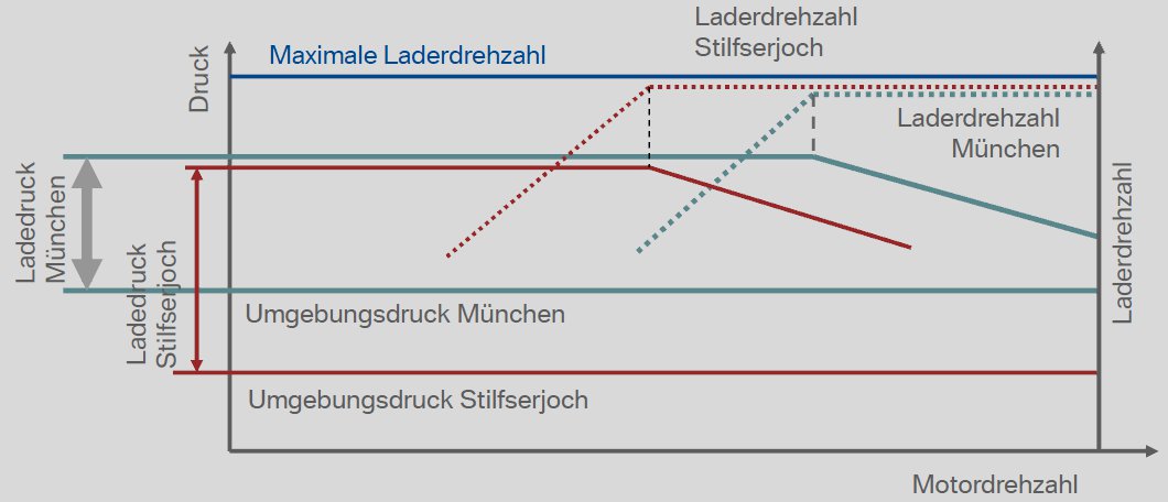 Dabei muss natürlich beachtet werden, dass der Turbolader seine bauartbedingte Höchstdrehzahl nicht überschreitet und Schaden nimmt. In unterschiedlichen Höhen kommen also ganz automatisch andere Laderdrehzahlen zum Einsatz, weil die Motorsteuerung den Mangel an Sauerstoff auszugleichen versucht. Durch die limitierte Drehzahl des Turboladers ist zwar kein völliger Ausgleich des niedrigeren Sauerstoffgehalts möglich, aber immerhin verlieren Turbomotoren bei 3000 Höhenmetern nur 15 bis 20 Prozent ihrer Leistung, während Saugmotoren etwa 30 Prozent der Motorleistung einbüßen.