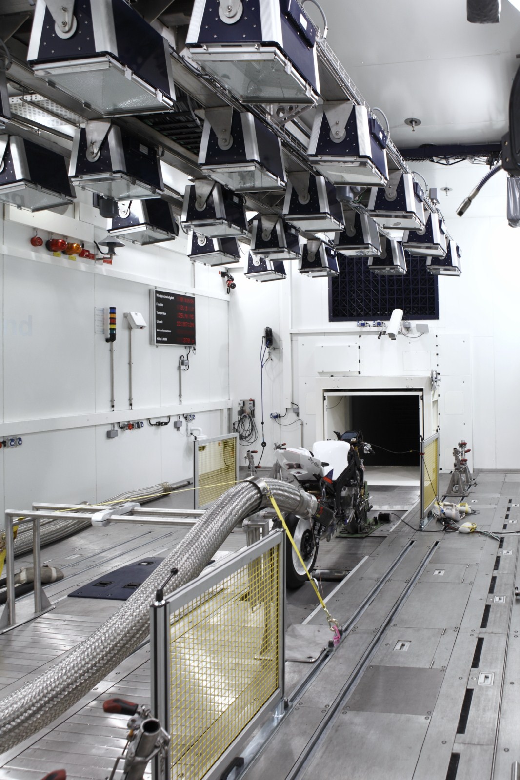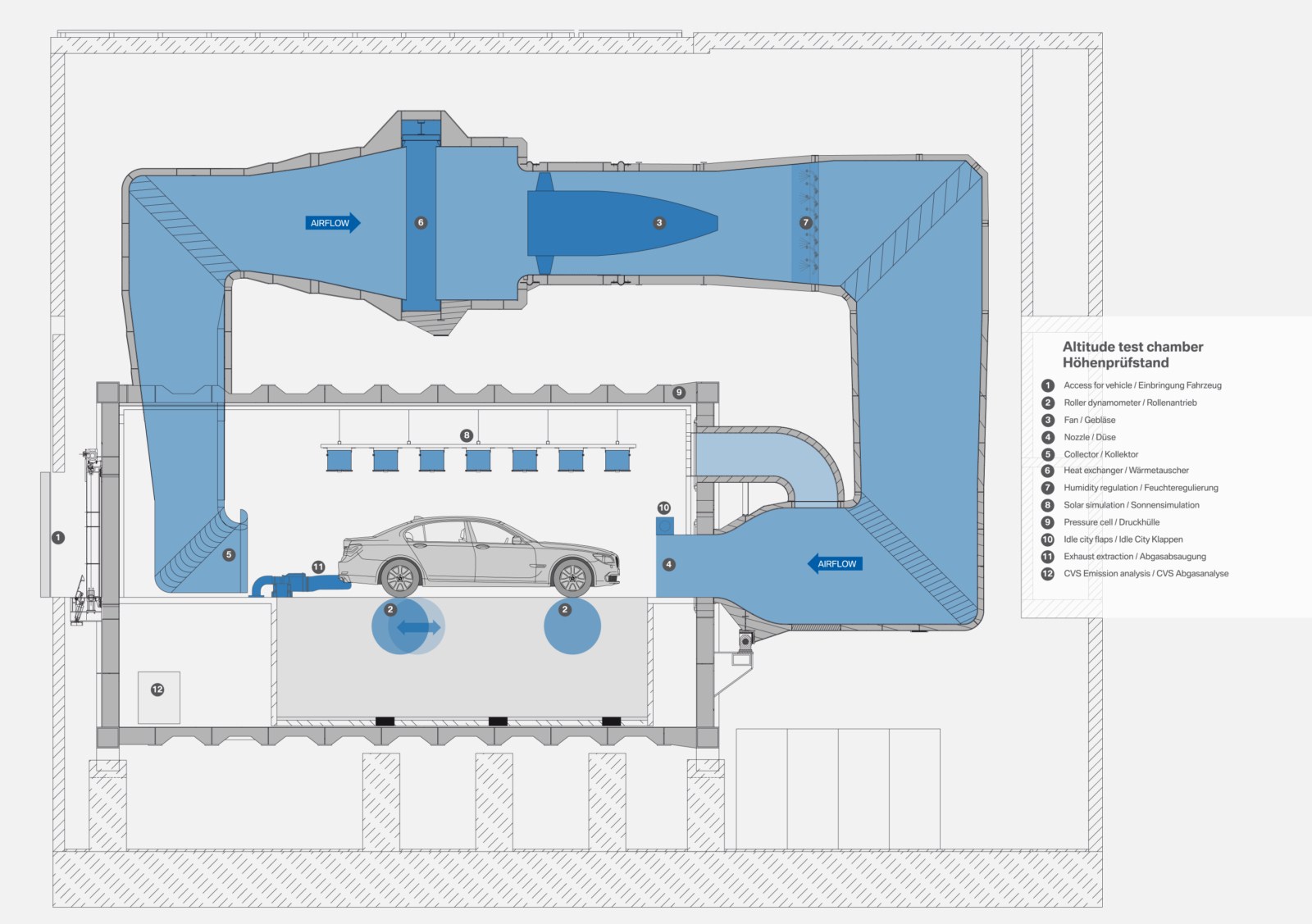 Um den Luftdruck in Höhen von bis zu 4200 Metern über dem Meeresspiegel simulieren zu können, ist eine thermisch isolierte Druckkammer nötig, die im Wesentlichen aus 60 Tonnen Stahl besteht. Natürlich lässt sich auch hier die Temperatur in einem Fenster von -30° bis +45° Celsius und die Luftfeuchtigkeit in einem Bereich von 5 bis 80 Prozent relativer Luftfeuchte einstellen. Die Windgeschwindigkeit im Höhenprüfstand beträgt maximal 250 km/h, bis zu einer Geschwindigkeit von 200 km/h funktioniert auch die CVS-Messtechnik für Abgase und Verbrauch. Abgerundet wird das Paket durch ein Solarium mit einer Leistung von 400 bis 1200 W/m², das auch extremste Sonneneinstrahlung simulieren kann.