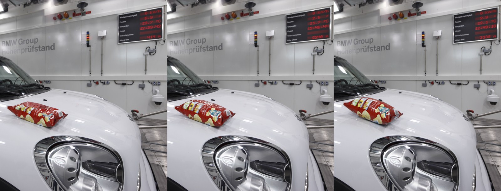 Sehr schön deutlich wird das bei folgendem Bild, das uns eine Chips-Tüte auf der Motorhaube des neuen MINI Countryman R60 bei verschiedenen Luftdrücken zeigt. Letztere kann man an der Anzeige an der Wand ablesen. Wie man sich denken kann, geht es beim Höhenprüfstand aber nicht vordergründig darum, die Auswirkungen auf die eventuell an Bord befindlichen Chipstüten zu untersuchen.
