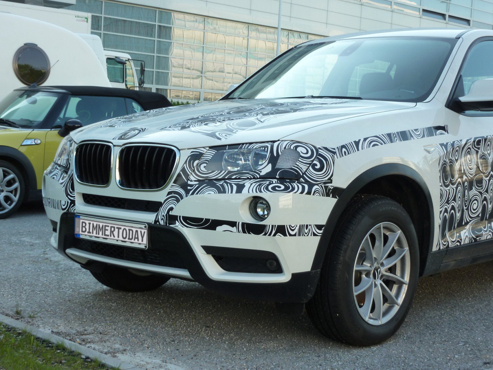 Während die Scheinwerfer noch getarnt sind, ihre Form aber kaum noch verbergen, sind die Nieren bereits völlig enttarnt. Der für den X3 charakteristische Lufteinlass zwischen den Nieren und dem Kennzeichen ist genau wie die Nebelscheinwerfer unterhalb der Frontscheinwerfer nicht mehr getarnt. Auch die sonstige Optik der Frontschürze ist nur noch notdürftig getarnt. Anhand des Endrohrs lässt sich vermuten, dass wir es mit einem Vierzylinder Diesel zu tun haben, es dürfte sich also um einen BMW X3 xDrive20d handeln.
