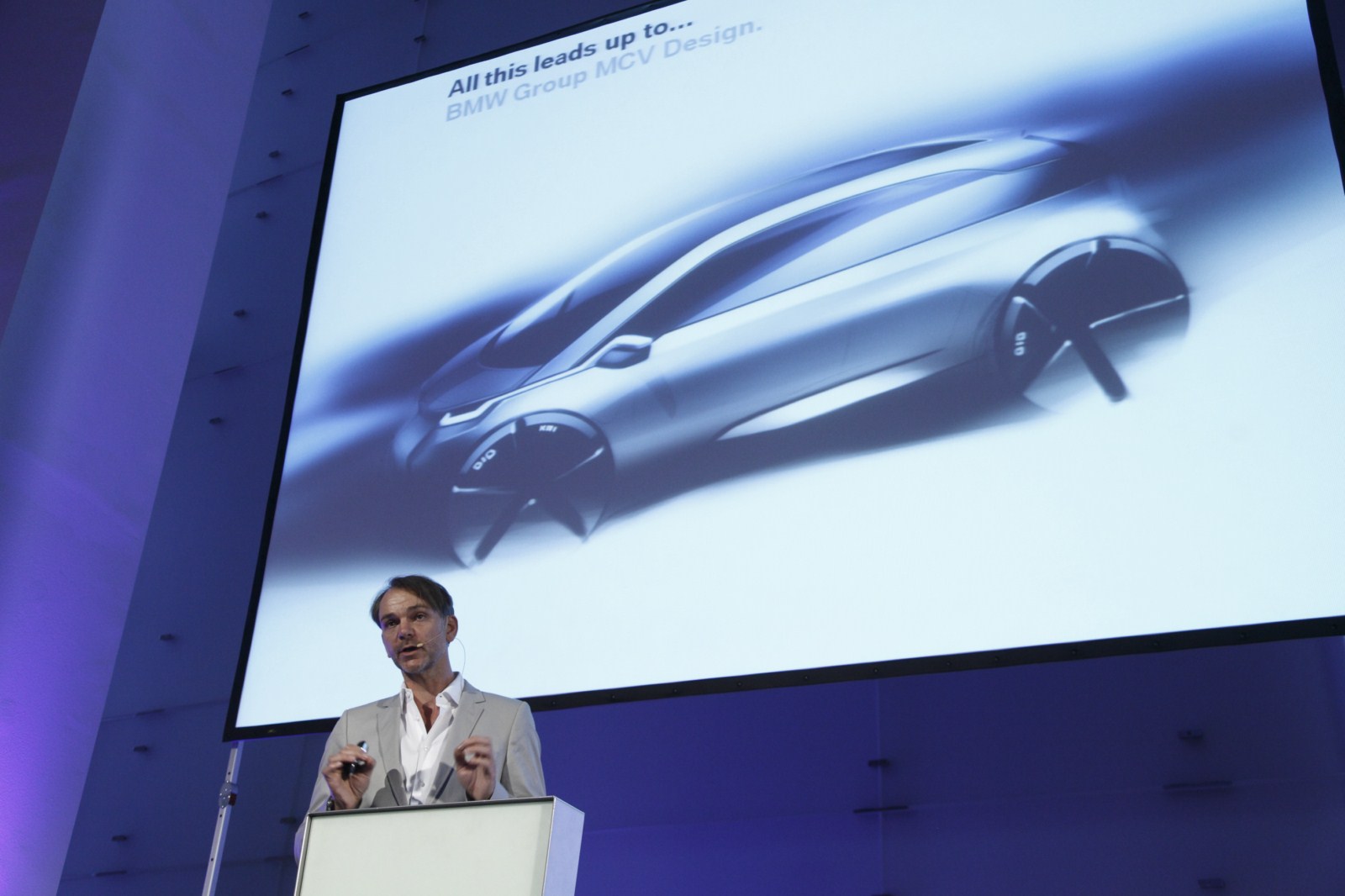 Außerdem muss das Fahrzeug auch mit seinem Design die Botschaft transportieren, dass es sich hier um etwas Neues und etwas Besonderes handelt. Um beispielsweise den Leichtbau zu betonen, wurde auch großer Wert auf optische Leichtigkeit gelegt. Da uns Adrian van Hooydonk auch gleich noch zwei Skizzen präsentierte, können wir die Elemente dieser Leichtigkeit auch gut nachvollziehen: Durch die extrem lang gezogene Frontscheibe sowie die optisch unterbrochene C-Säule wirkt die gesamte Karosserie extrem leicht und luftig – was ja dank des massiven Einsatzes von Carbonfasern auch der Fall sein wird.