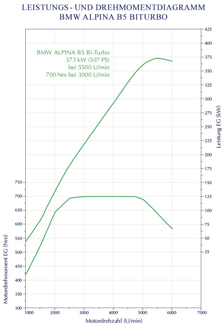 Das Triebwerk basiert auf dem intern N63 genannten Motor aus BMW 750i & Co. und findet sich auch im aktuellen Alpina B7 Biturbo. Genau wie im B7 leistet der umfangreich überarbeitete Motor auch im B5 BiTurbo 507 PS und stellt ein maximales Drehmoment von 700 Newtonmetern zur Verfügung. Letzteres liegt früher und in einem breiteren Bereich als beim Vorgänger an und soll das Fahrzeug in Verbindung mit der Achtgang-Automatik noch souveräner machen.