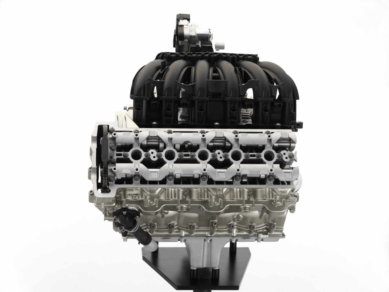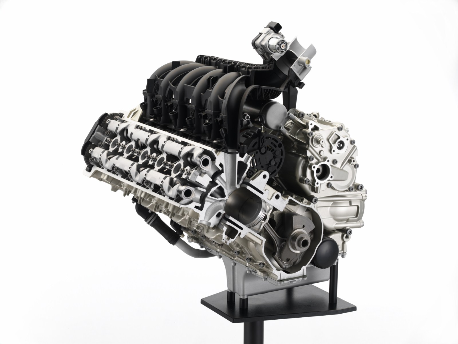 Das zweiteilige Zylinder-Kurbelgehäuse besteht aus hochfesten Aluminiumlegierungen. Die Teilungsebene verläuft in der Kurbelwellenmitte. Das kompakte, im Sandgussverfahren hergestellte Oberteil bildet einen hochsteifen Verbund aus den sechs Zylindern und dem oberen Lagerstuhl für die Kurbelwelle.