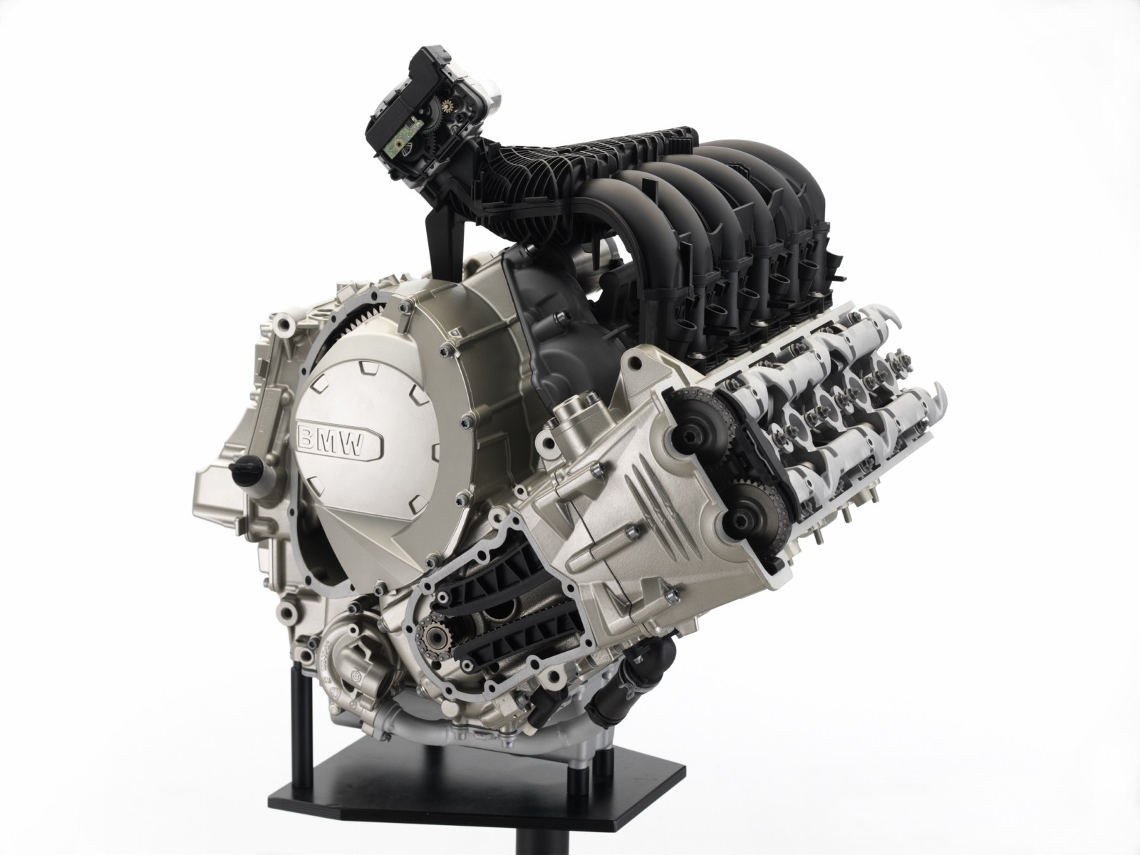 In seinem Layout lehnt sich der Sechszylinder-Reihenmotor an den bekannten Vierzylinder-Reihenmotor der K 1300 Baureihe an und verfügt wie dieser über eine um 55 Grad nach vorn geneigte Zylinderachse. Hieraus resultieren nicht nur ein niedriger Schwerpunkt, sondern auch eine ausgewogene Gewichtsverteilung von 52 zu 48 Prozent (K 1600 GT unbeladen) – bei dynamischer Fahrweise unverzichtbar für ein präzises Fahrgefühl und eine transparente Rückmeldung der Frontpartie. Die Neigung des Motors schafft zudem Platz für eine strömungsgünstige Sauganlage direkt über dem Motor, und sie ermöglicht die ideale Auslegung der Rahmenprofile gemäß dem Kraftfluss.