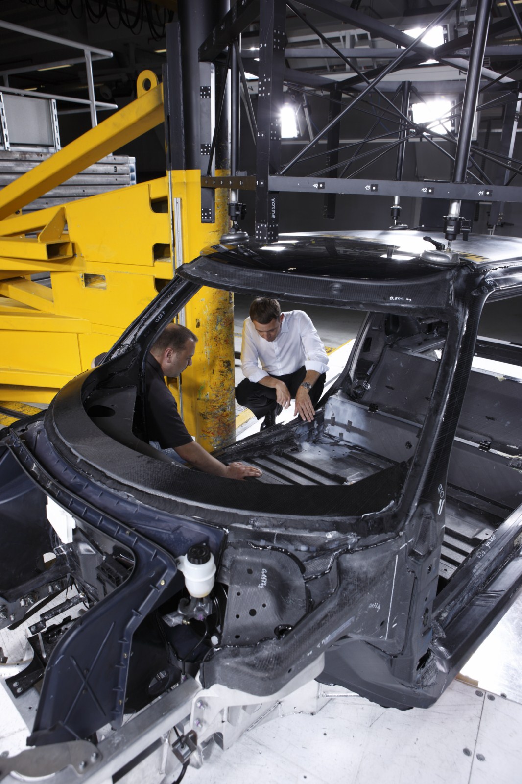 Bleibt die Frage nach extremen Unfällen: Was geschieht mit beschädigten Carbon-Elementen? Zunächst einmal ist klar, dass es auch beim MCV wirtschaftliche Totalschäden geben wird, bei denen eine Reparatur nicht mehr sinnvoll möglich ist. In der Regel lassen sich Beschädigungen der Carbon-Elemente aber relativ gut beheben, denn die Beschädigungen treten bei diesem Werkstoff sehr lokal auf und haben keine Auswirkungen auf die gesamte Karosserie. Beschädigte Teile lassen sich an den Klebestellen trennen oder auch aussägen, neue Teile können dann mit modernster Technik wieder eingefügt werden.