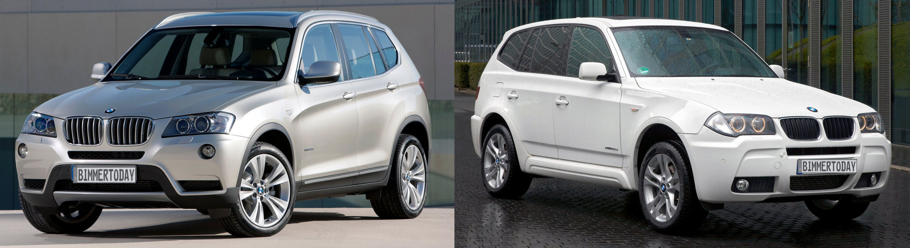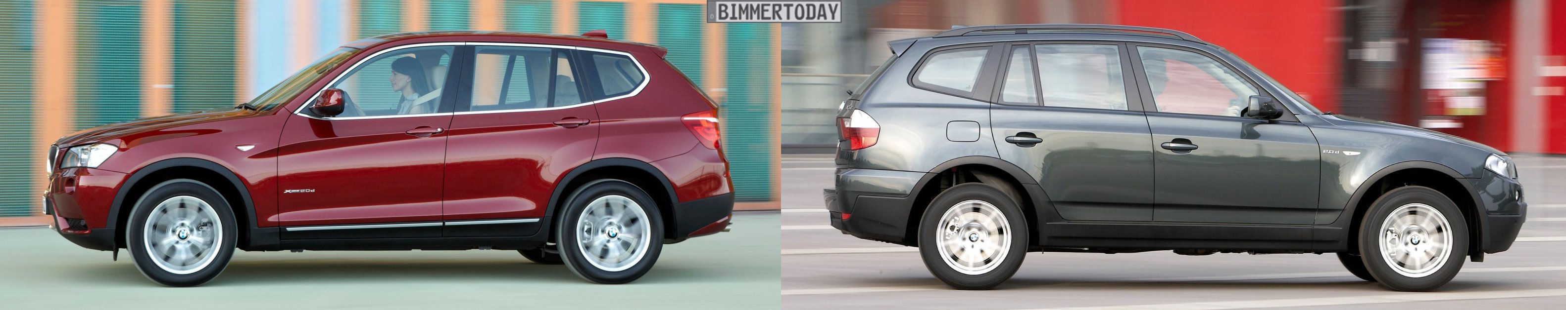 Am Heck ist auch der neue F25 eindeutig als BMW X3 erkennbar, die Rückleuchten sind aber deutlich moderner gestaltet. Horizontale Linien betonen bei beiden Generationen die Breite das Fahrzeugs. Auch in der Seitenansicht sind die Charakterlinien nun dominanter und auffälliger als bisher, dennoch hat die zweite Generation die wesentlichen Eckpunkte des X3-Designs übernommen. In der Seitenansicht fällt auch die höhere Front ins Auge, die einen Tribut an den Fußgängerschutz darstellt.