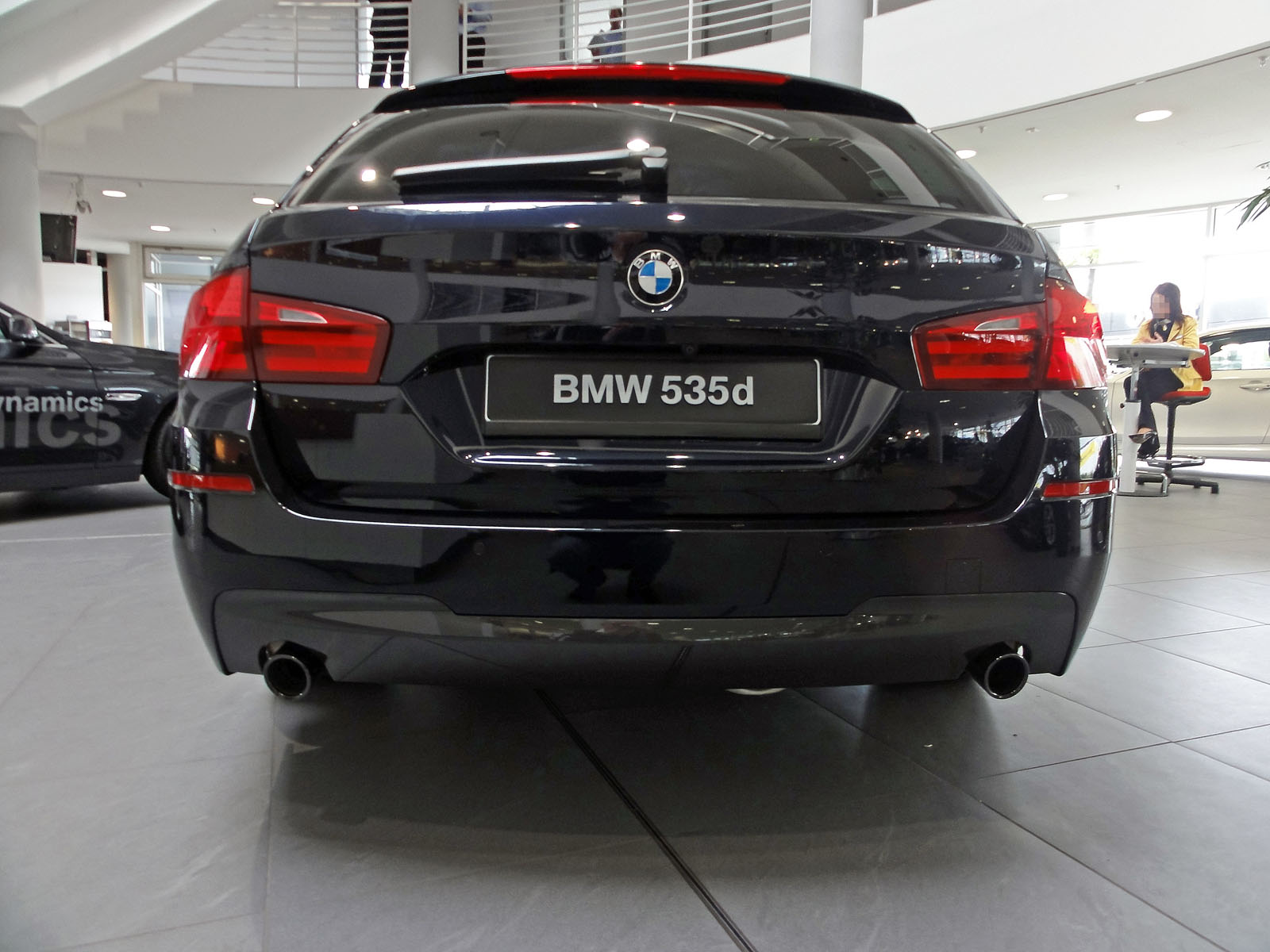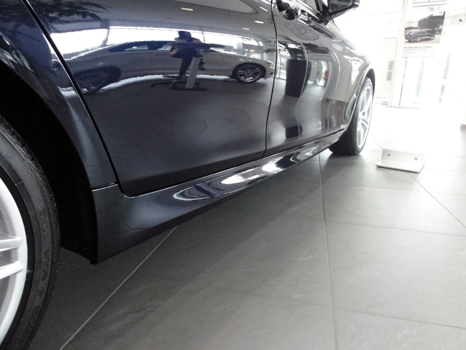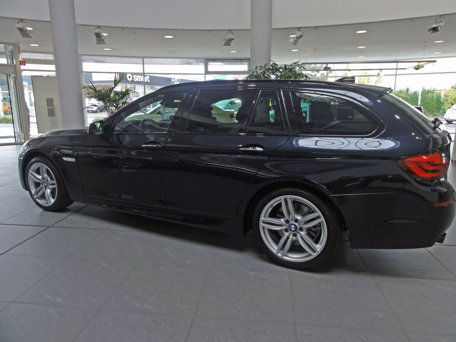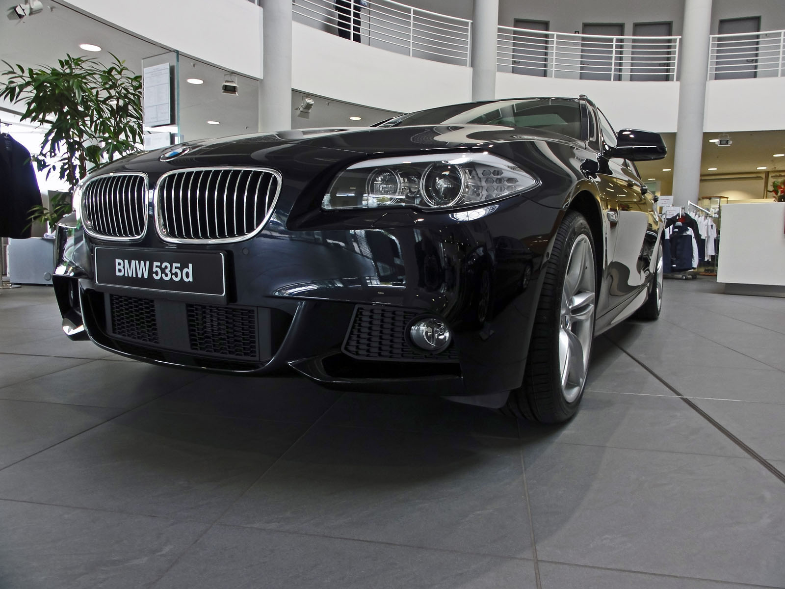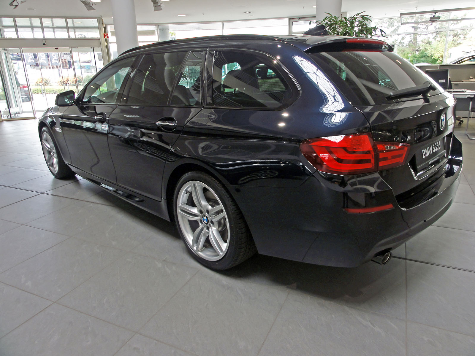 Wir konnten heute einen 535d Touring mit M-Paket in Carbonschwarz Metallic, ausgestattet mit der optionalen M-Doppelspeiche 351 in 19″ ausführlich in Augenschein nehmen. Die Front- und Heckschürze fällt bei den Modellen F10/F11 unaufdringlicher und weniger auffällig aus. Es mehren sich nun allerdings Beiträge in Internetforen, die eine gewisse Aggressivität in der Optik vermissen.