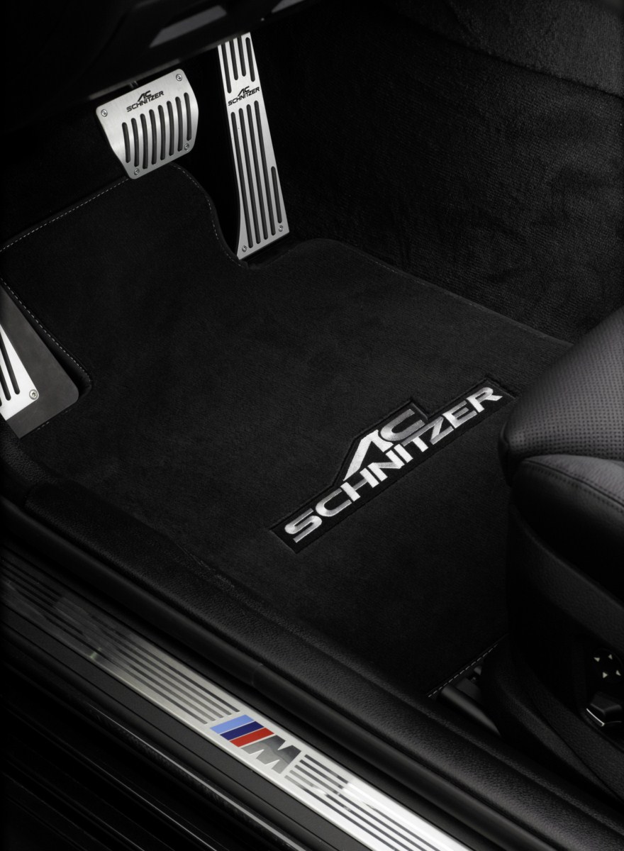 Mehr den Augen und Ohren als der Leistungssteigerung werden die Doppelendschalldämpfer mit typischen Schnitzer Endblenden dienen. Im Innenraum wird ebenfalls umfangreich Hand angelegt und es sind neben Fußmatten mit AC Schnitzer Schriftzug und Sportlenkrad auch selbstentwickelte, schwarze Carbonleisten im groben Flechtmuster und eine Pedalerie mit Fußstütze aus Aluminium wählbar.