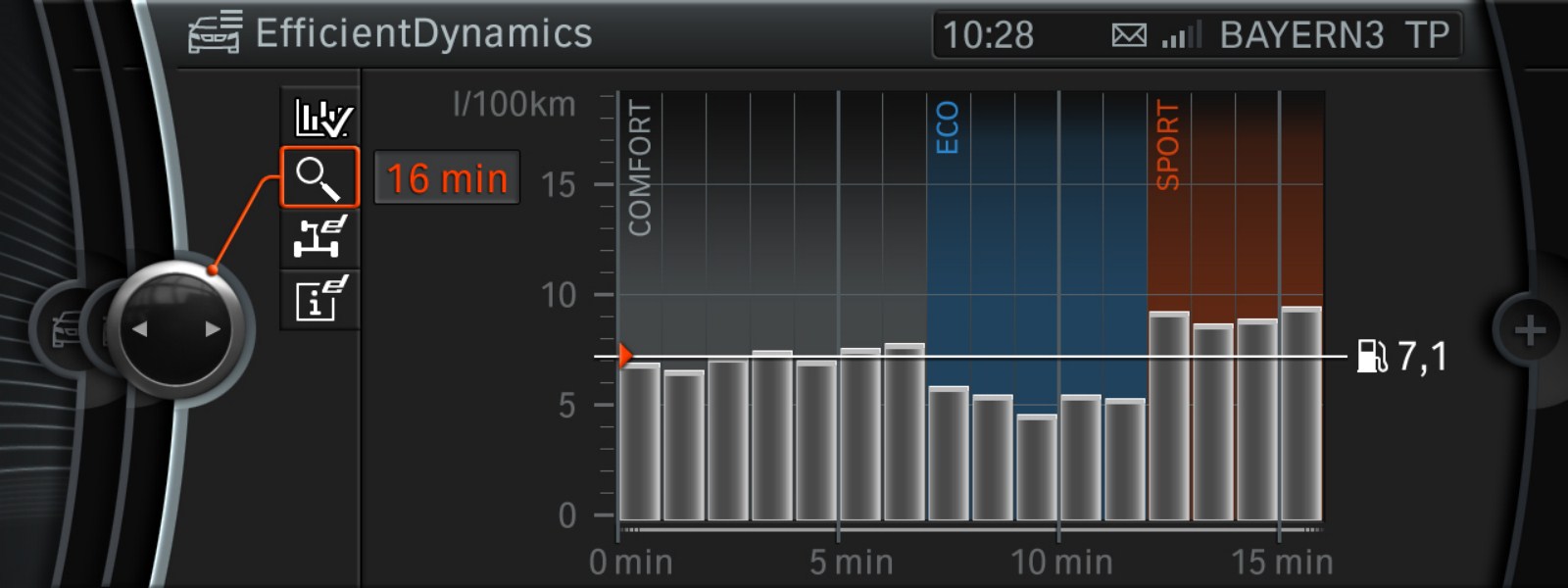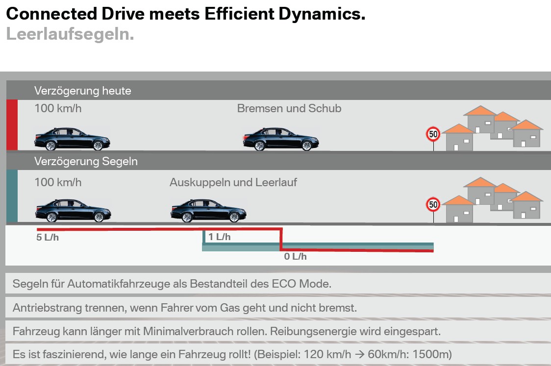Genau in die andere Richtung geht eine neue Entwicklung von BMW EfficientDynamics, denn mit dem geplanten ECO-Modus soll der Fahrer zu besonders sparsamem Fahren erzogen werden. Im Display bekommt er dann beispielsweise angezeigt, wieviel Kilometer Reichweite er durch sein zurückhaltendes Fahren gewonnen hat – allein durch eine entsprechende Anpassung des Fahrverhaltens sind Einsparungen von bis zu 10 Prozent möglich. Durch die geplanten Funktionen Leerlaufsegeln und Vorausschauassistent steigt dieser Wert auf 15 Prozent.