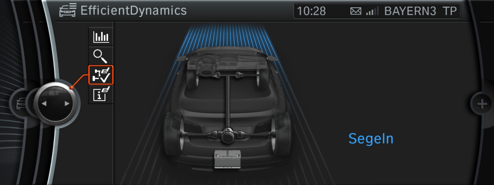 Aber was ist nun mit Segeln gemeint? Die Funktion Leerlaufsegeln ermöglicht es auch bei Fahrzeugen mit Automatikgetriebe, allein die kinetische Energie des Fahrzeugs auszunutzen und den Kraftschluss zwischen Motor und Getriebe zu trennen. In diesem Modus sorgen nur noch Roll- und Luftwiderstand für eine gewisse Verzögerung, der Verbrauch liegt aber bei nur 0,5 bis 1,0 Liter pro Stunde. Betätigt der Fahrer kurz die Bremse, nutzt das Fahrzeug die Motorbremse und rekuperiert wie gewohnt die Bremsenergie. Mit Hilfe der Menüs lassen sich auch für die sonstigen Verbraucher wie Klimaanlage und Sitzheizung spezielle Effizienzprogramme aktivieren.