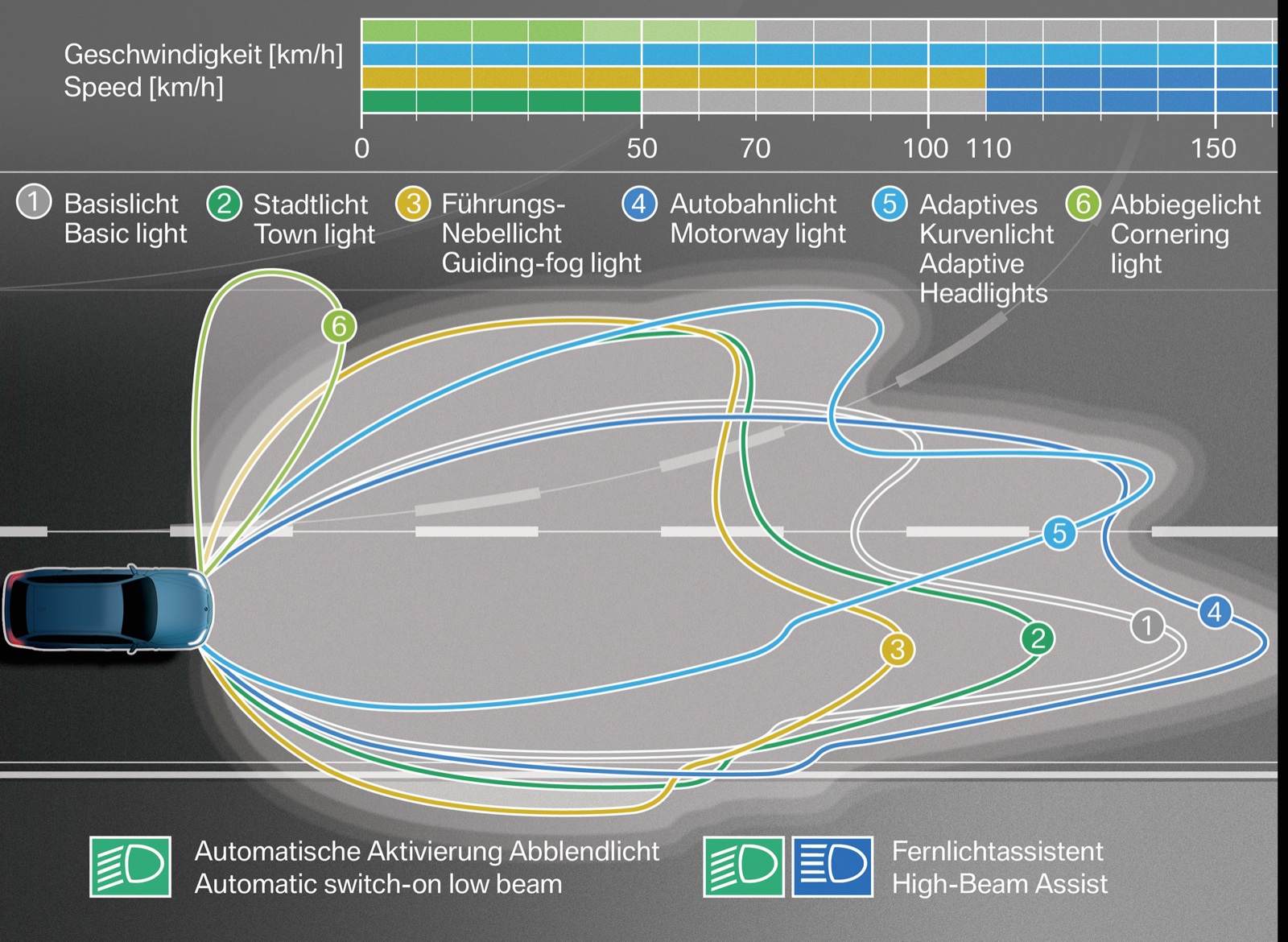 Das Adaptive Kurvenlicht wird um eine variable Lichtverteilung ergänzt, die die Ausleuchtung der Straße bei Stadt, Land oder Autobahnfahrt variiert. Ergänzt wird das System um eine Abbiegelichtfunktion, die beispielsweise an Kreuzungen hilfreich sein kann.