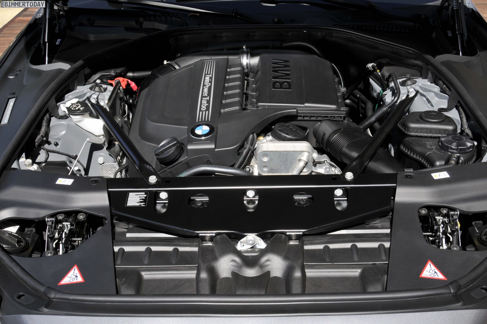 Immerhin erhalten wir einen ersten Blick auf die Motorabdeckung der neuesten Ausbaustufe des N55 mit TwinScroll-Lader. Die 320 PS starke Variante des Reihensechszylinders wird künftig auch in anderen Baureihen Verwendung finden, bleibt aber zum Marktstart im Frühjahr zunächst exklusiv dem 6er vorbehalten. Das maximale Drehmoment von 450 Nm liegt in einem breiten Fenster von 1.300 bis 4.500 U/min an und dürfte die serienmäßig Achtgang-Automatik bei ihrer unauffälligen Arbeit unterstützen.