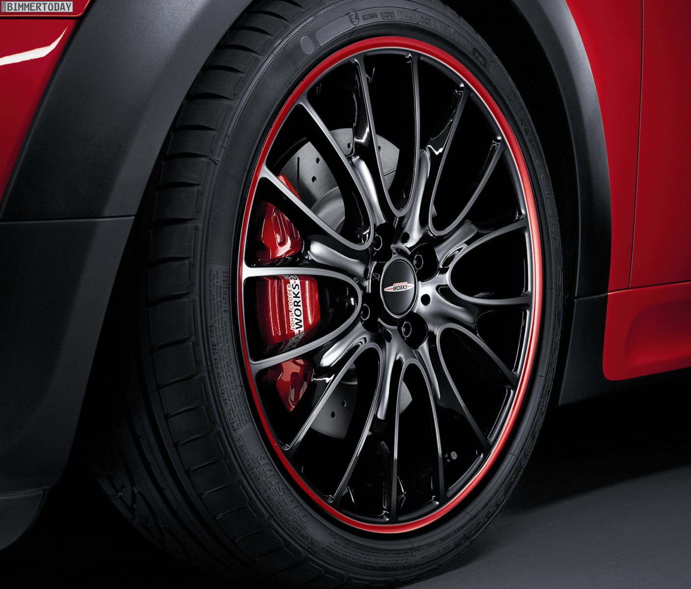Bestandteil des John Cooper Works-Paket sind neben dem Aerodynamik-Paket auch die Dynamic Traction Control DTC und das elektronische Sperrdifferential EDLC, das bei schneller Kurvenfahrt das kurveninnere Vorderrad gezielt abbremst und somit das Einlenkverhalten des Fahrzeugs unterstützt. Dazu kommen die gewichtsoptimierten Leichtmetallräder John Cooper Works Cross Spoke Challenge im 17 Zoll-Format sowie ein Sport-Lederlenkrad mit roten Kontrastnähten. Im Innenraum kommen zudem ein Schaltknauf mit rotem Schaltschema, ein Lederbalg für Schaltknauf und Handbremse mit roten Kontrastnähten sowie spezielle Einstiegsleisten zum Einsatz.