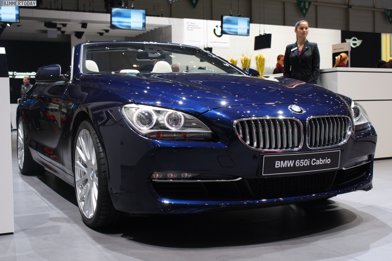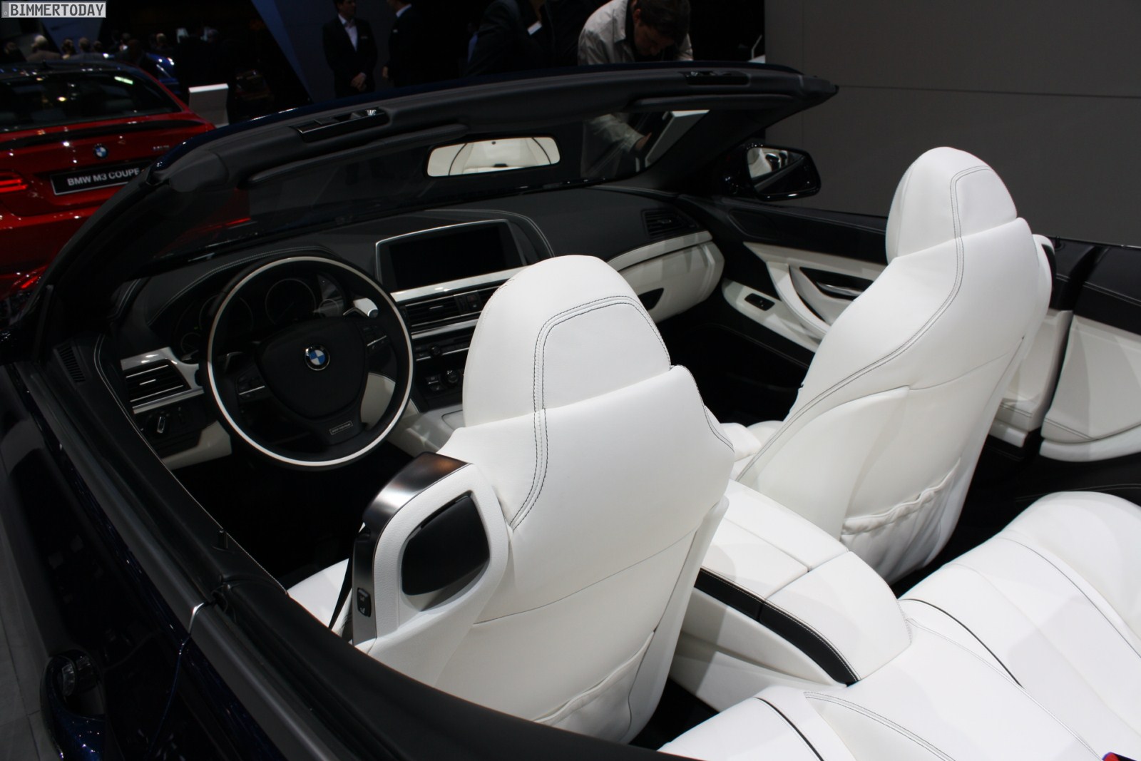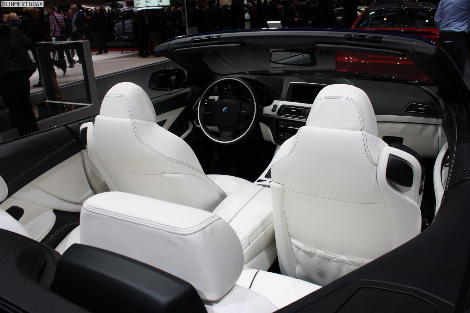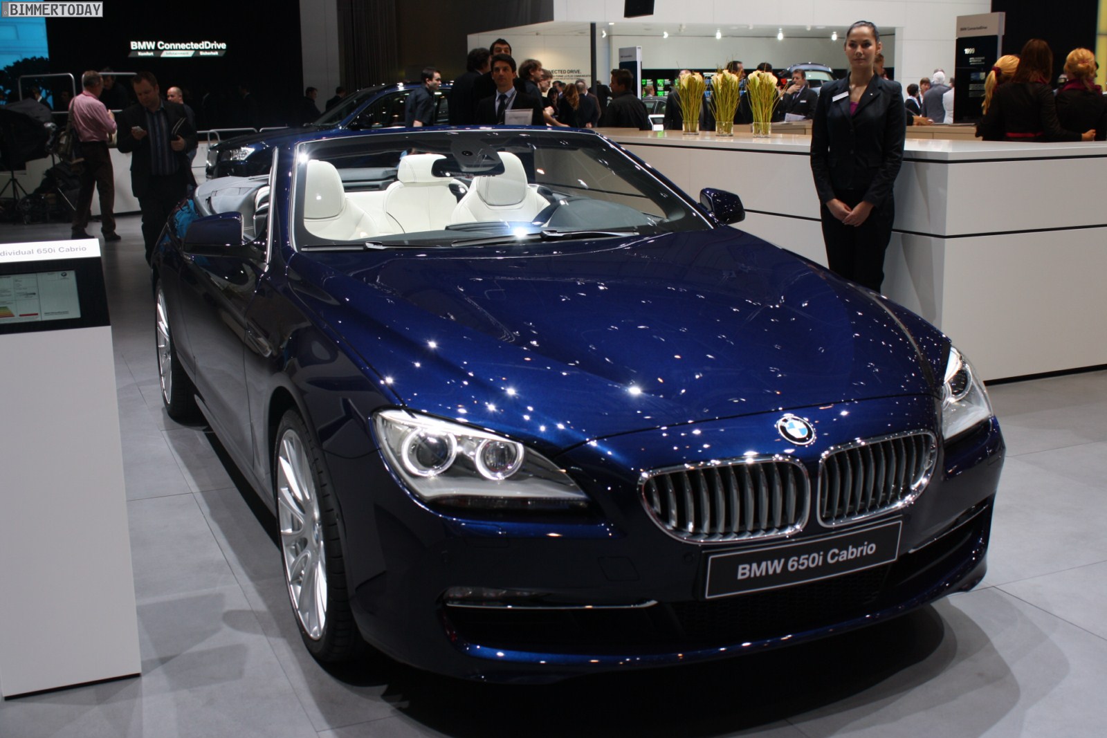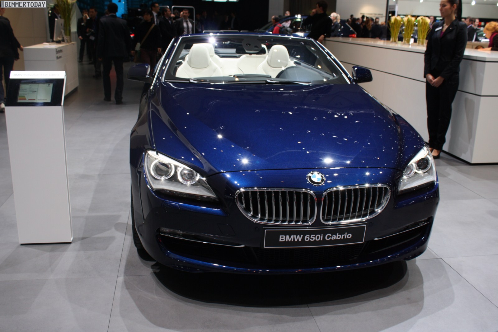 Eines der Highlights auf dem Stand von BMW ist ein neues BMW 650i Cabrio Individual der Generation F12, das in der attraktiven Außenfarbe Tansanitblau Metallic lackiert ist. Beeindruckend ist auch der Innenraum, in dem die Farben Weiß und Schwarz für interessante Kontraste sorgen und eine exklusive Atmosphäre schaffen. Beinahe alle sichtbaren Nähte sind in der jeweiligen Kontrastfarbe ausgeführt und wirken entsprechend hochwertig.
