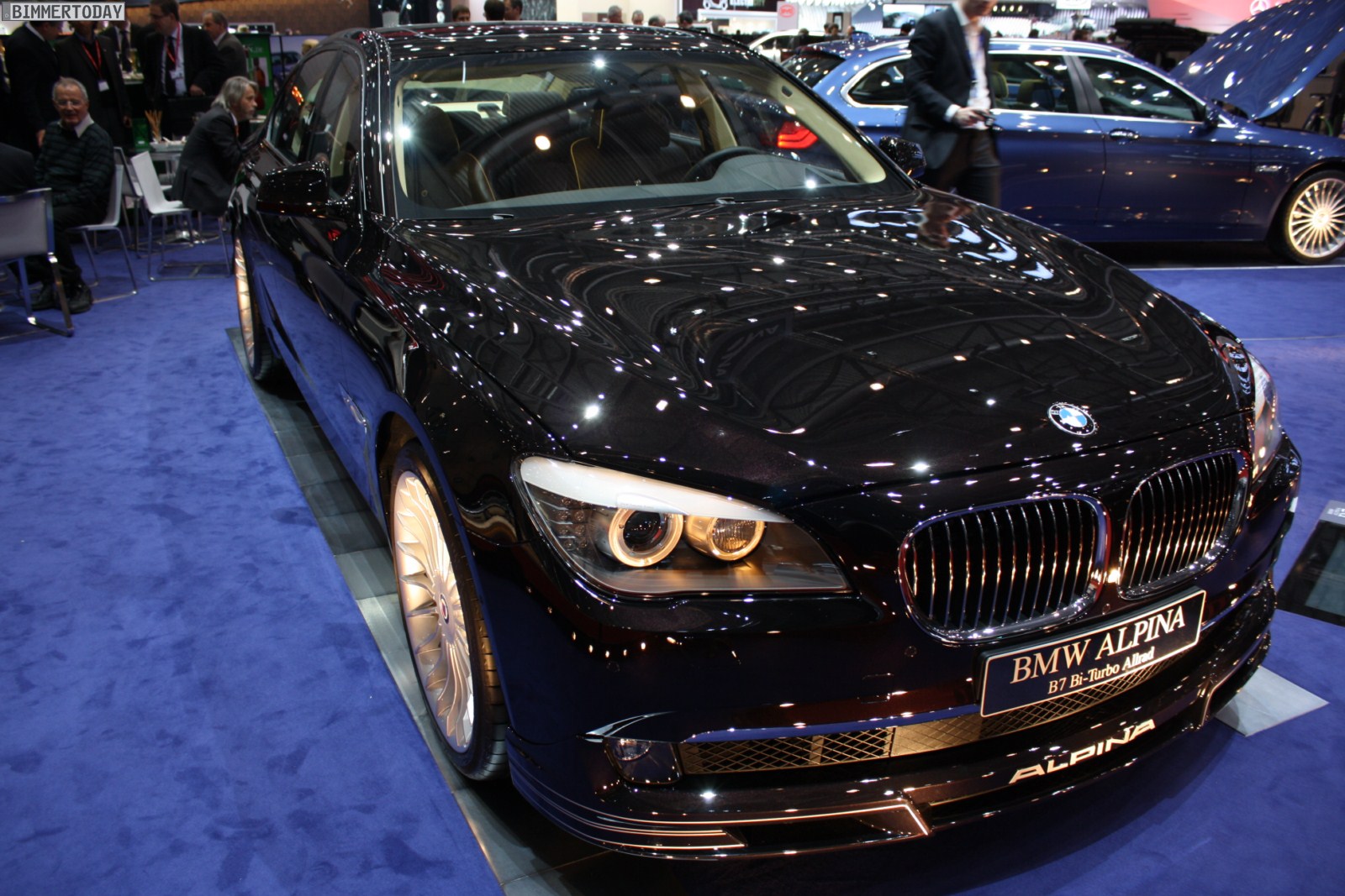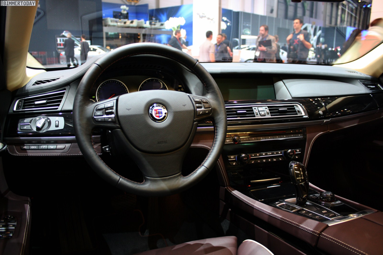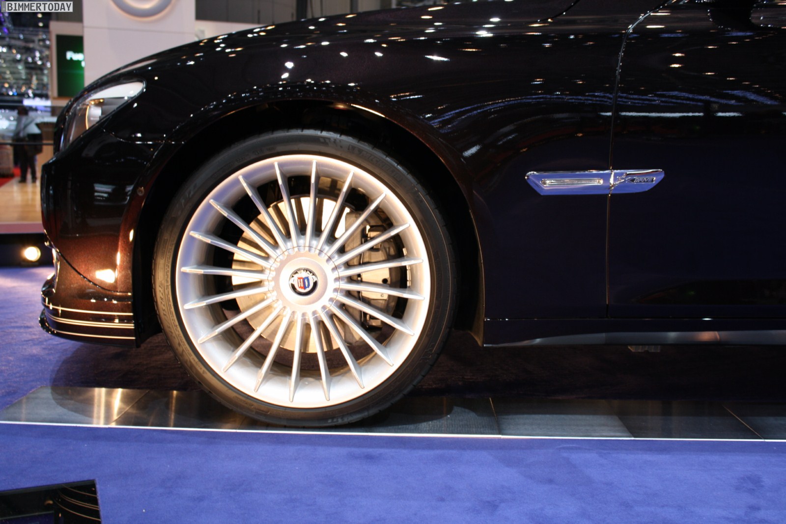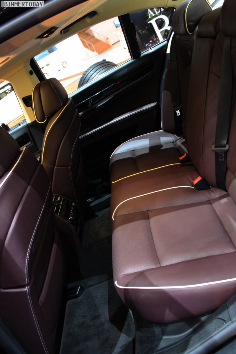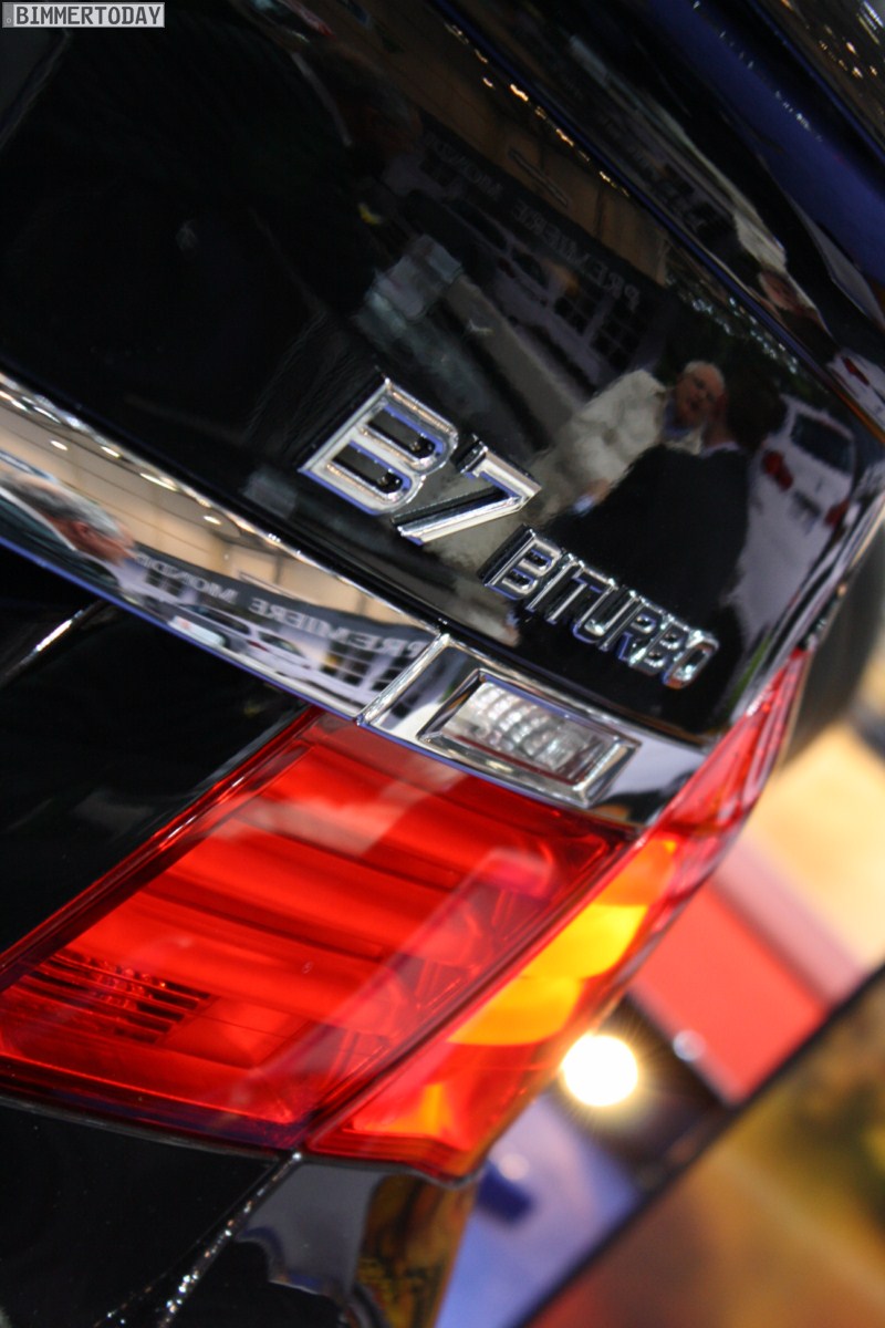 Auf vielfachen Wunsch haben wir uns in Genf auch Zeit für den BMW Alpina B7 Biturbo genommen, der als Allradfahrzeug mit BMW xDrive ausgestellt war. Während B5 Limousine und Touring in Alpinablau und das B3 S Cabrio in Alpinagrün ausgestellt waren, trug die B7 Limousine keine Alpina-Lackierung. Weniger exklusiv war die Außenfarbe dennoch kaum, denn es handelt sich um die Individualfarbe Rubinschwarz Metallic, die sich durch einen dezenten rötlichen Akzent von den normalen Schwarztönen unterscheidet.