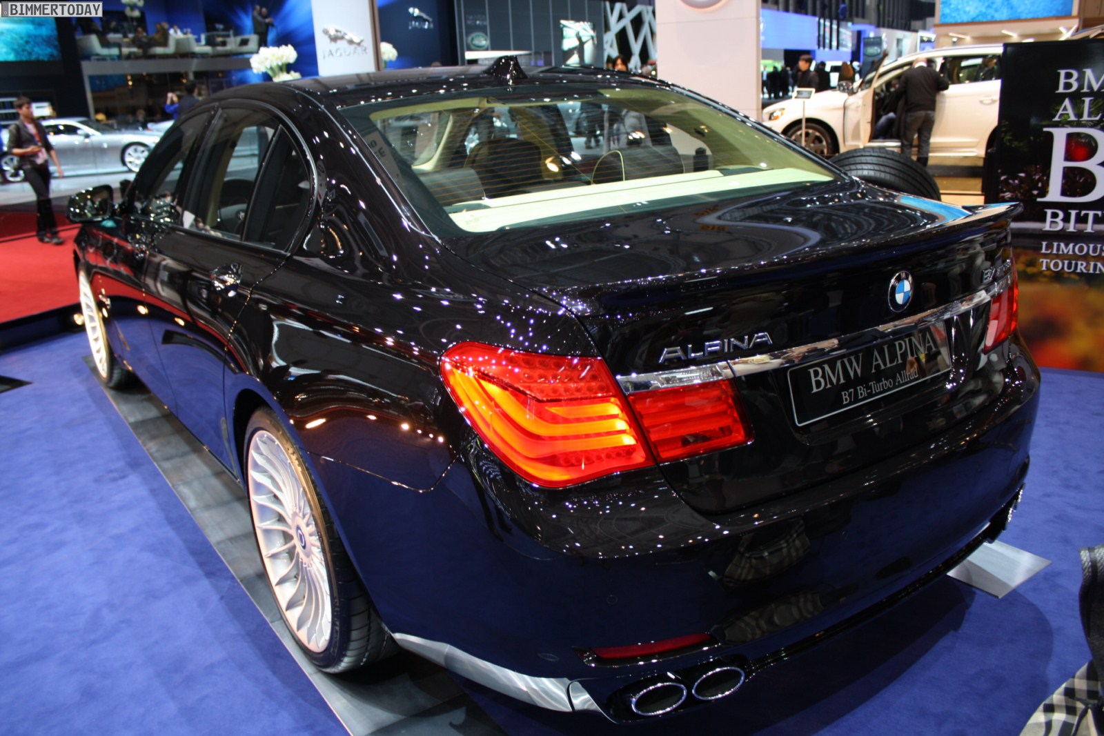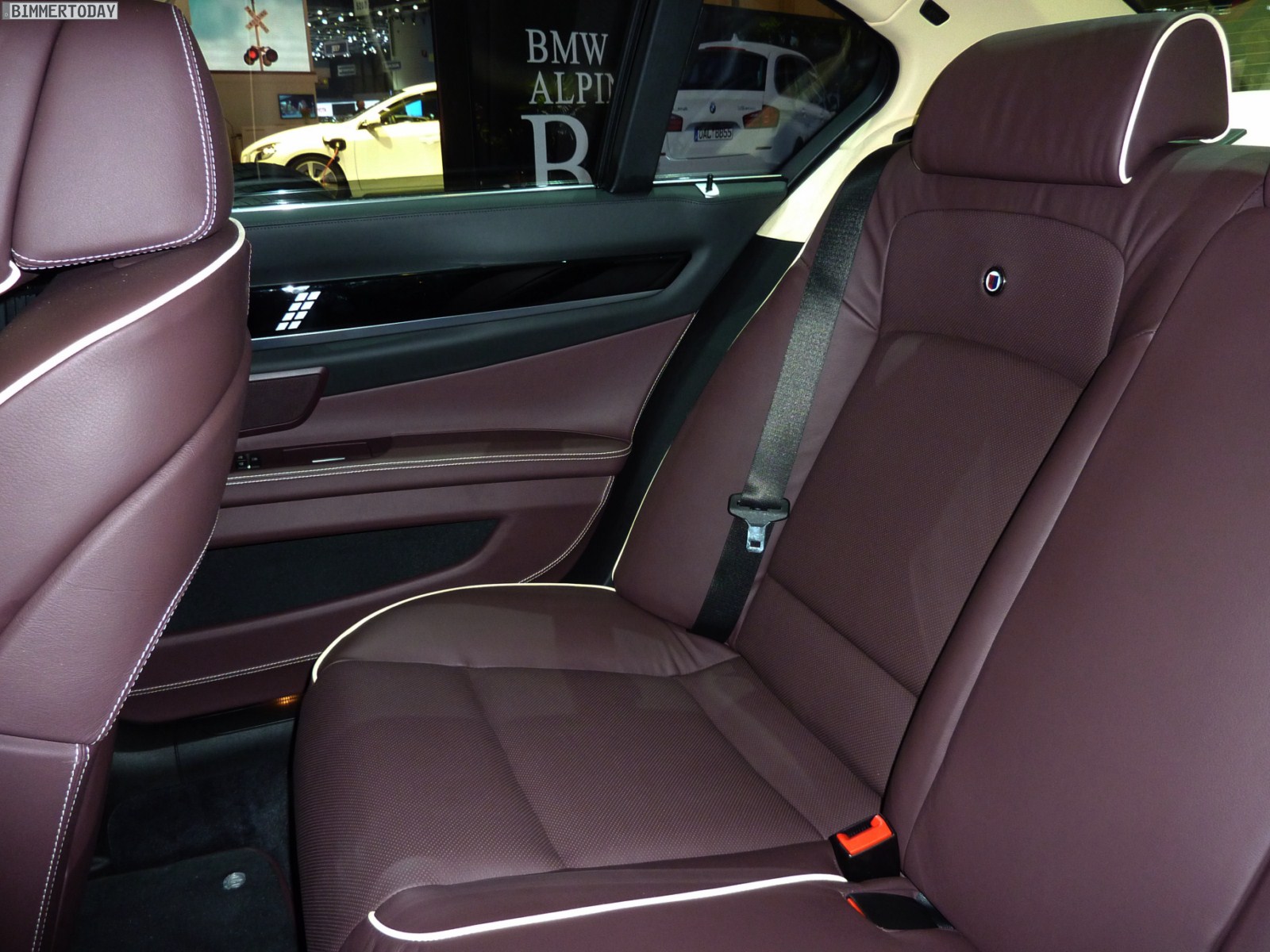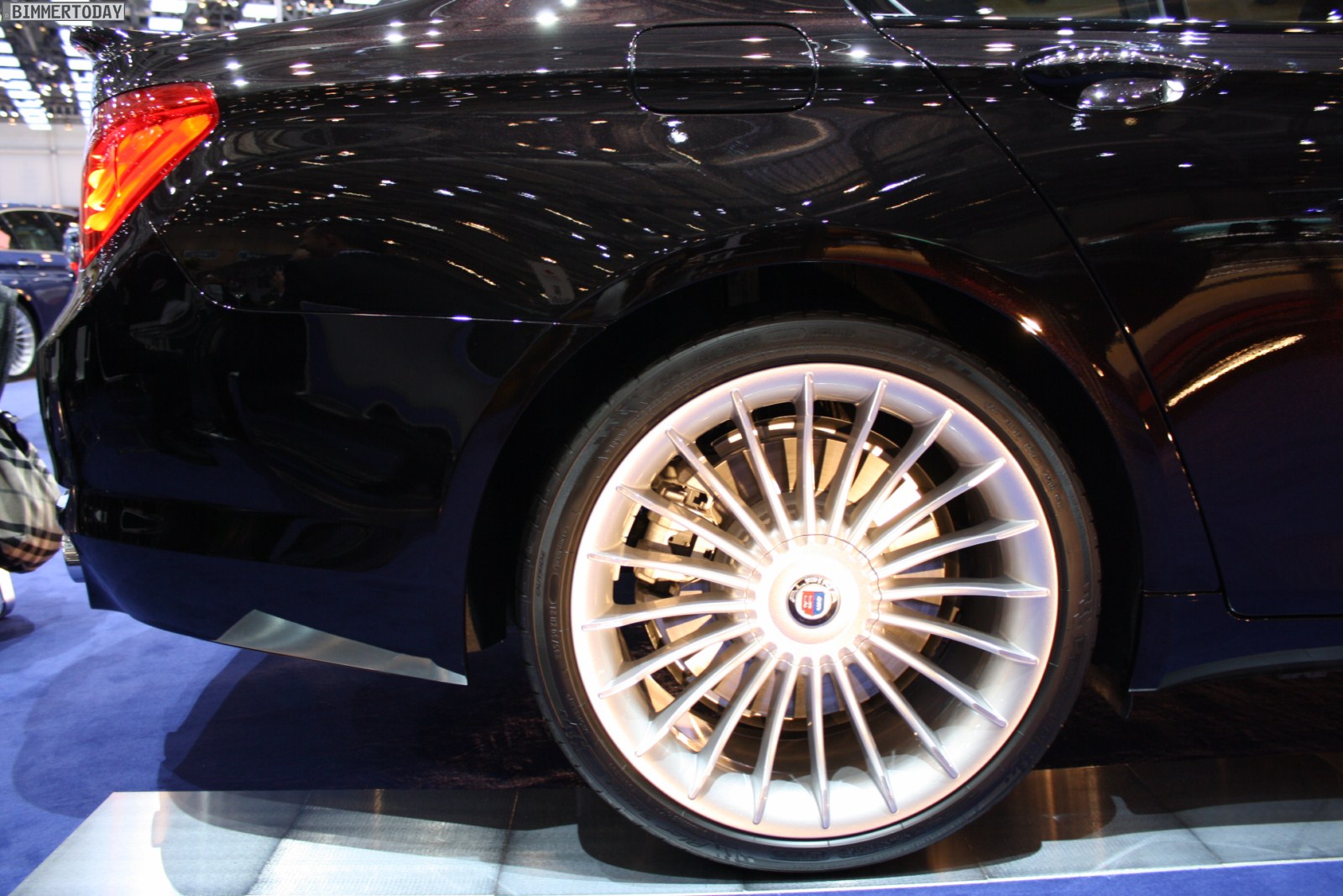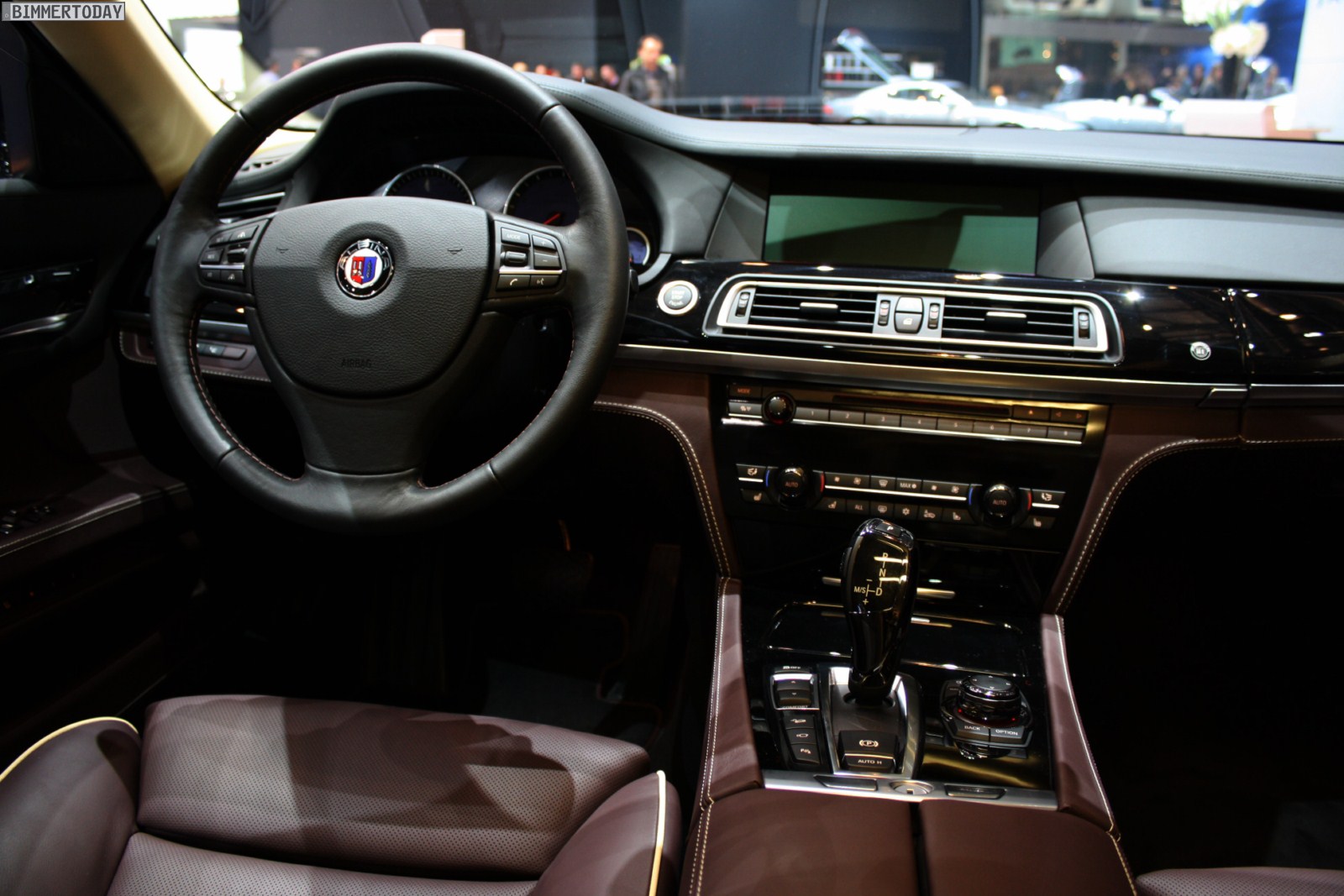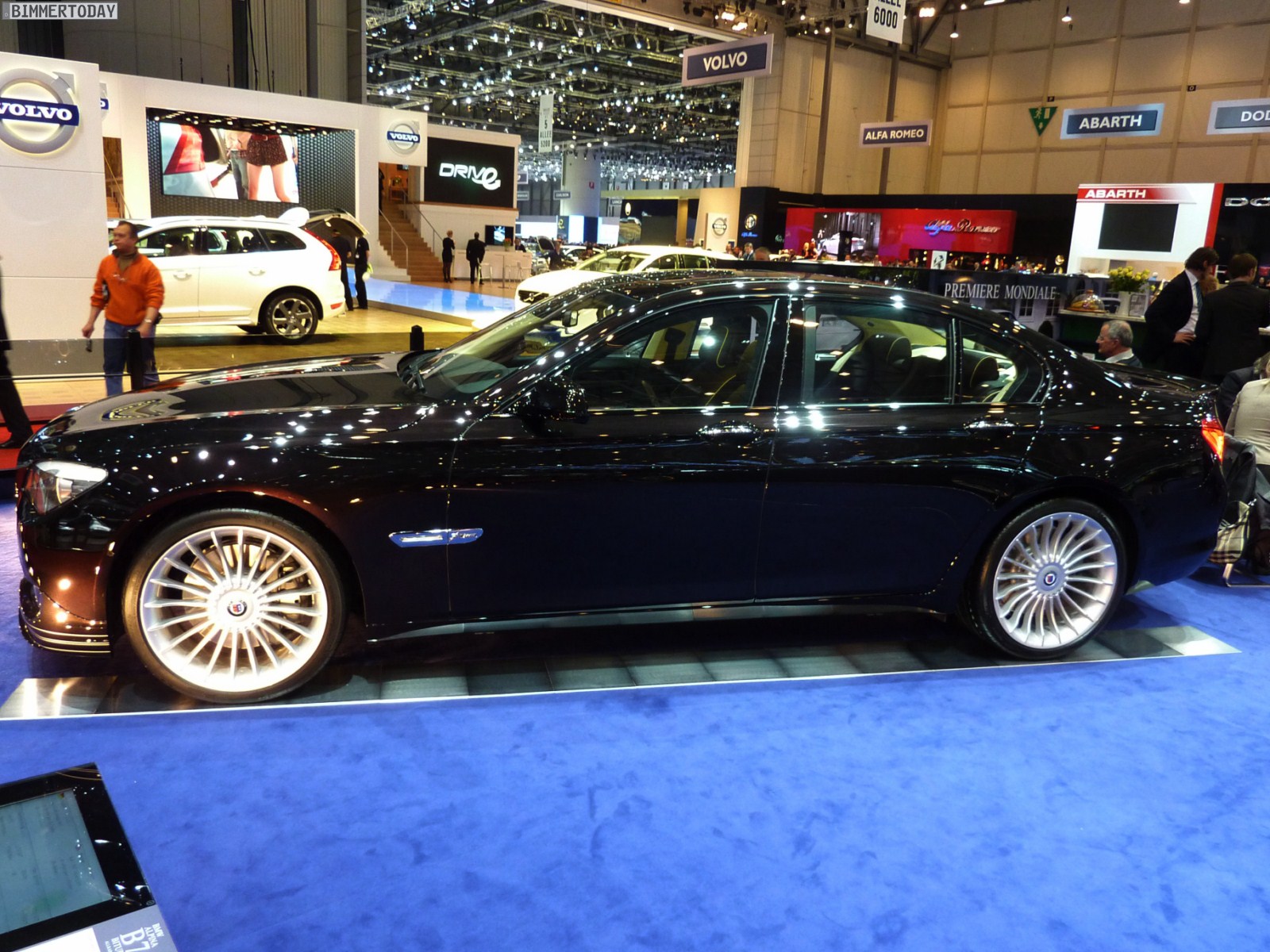 Auf vielfachen Wunsch haben wir uns in Genf auch Zeit für den BMW Alpina B7 Biturbo genommen, der als Allradfahrzeug mit BMW xDrive ausgestellt war. Während B5 Limousine und Touring in Alpinablau und das B3 S Cabrio in Alpinagrün ausgestellt waren, trug die B7 Limousine keine Alpina-Lackierung. Weniger exklusiv war die Außenfarbe dennoch kaum, denn es handelt sich um die Individualfarbe Rubinschwarz Metallic, die sich durch einen dezenten rötlichen Akzent von den normalen Schwarztönen unterscheidet.