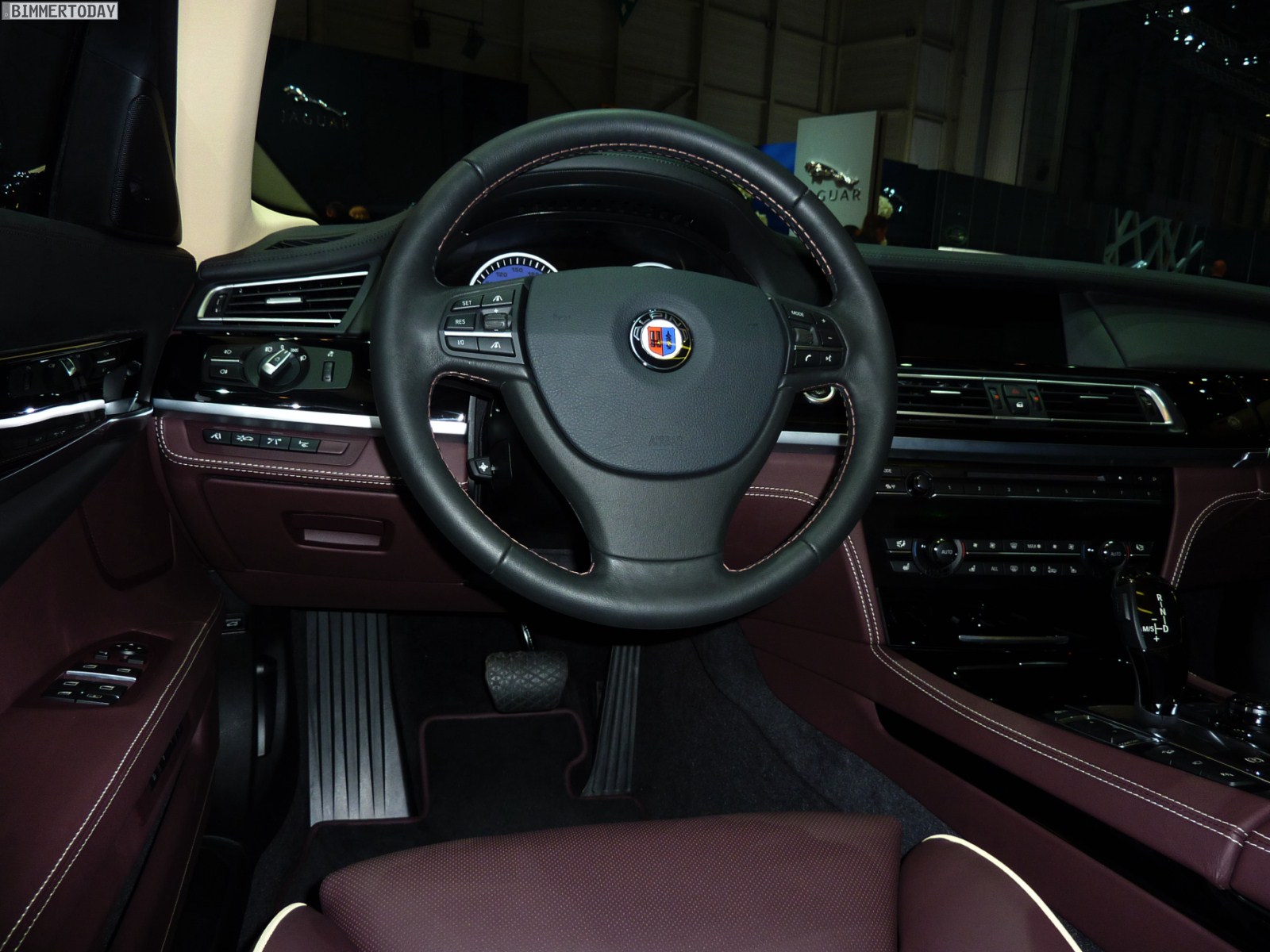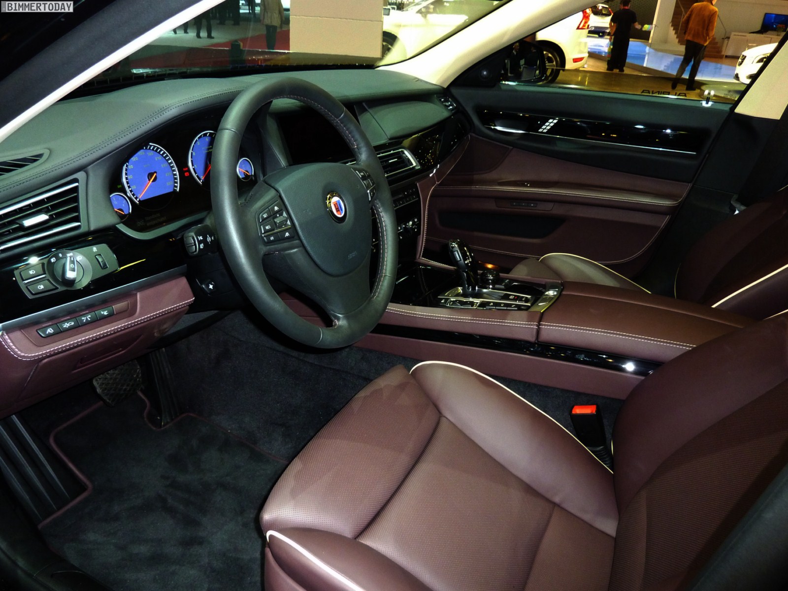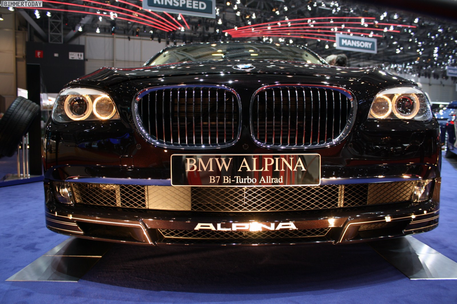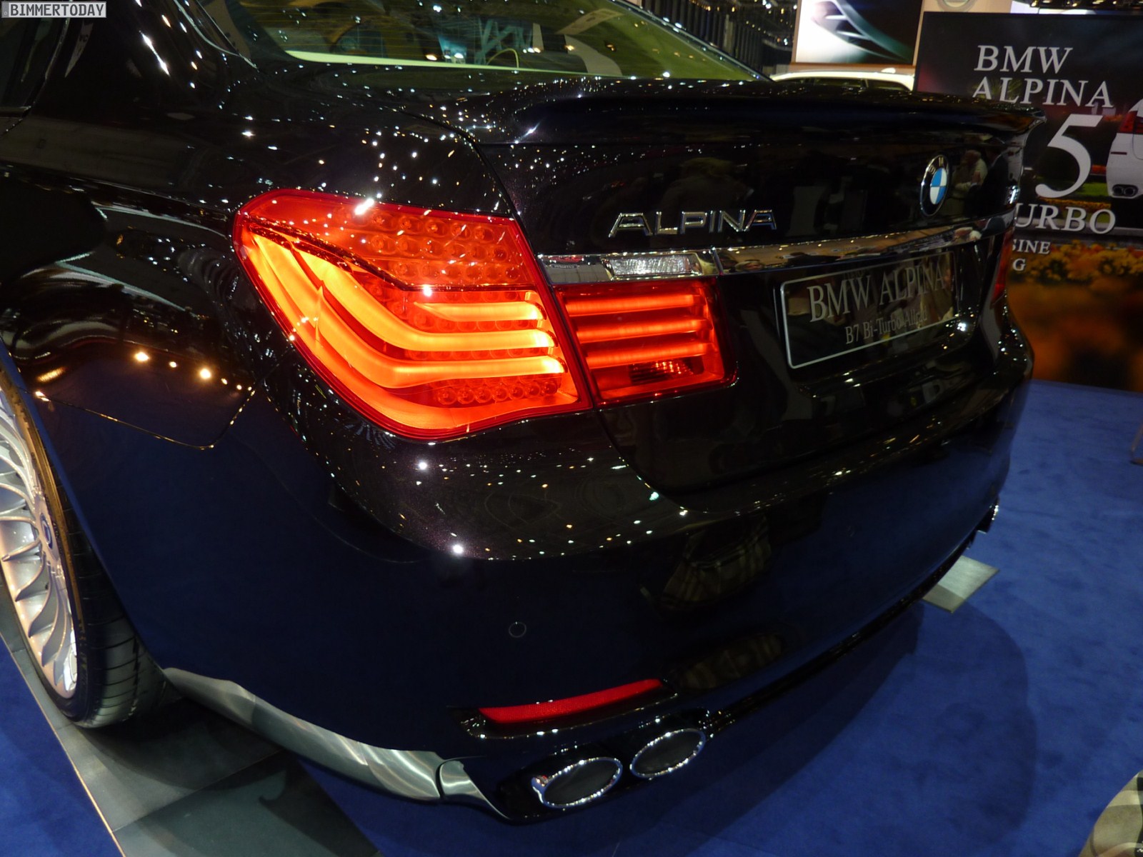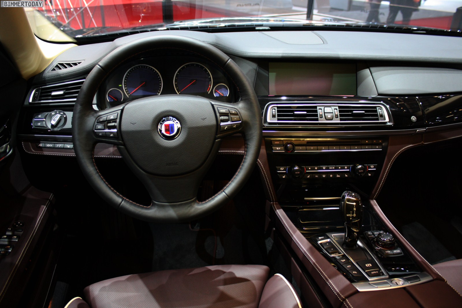 Auf vielfachen Wunsch haben wir uns in Genf auch Zeit für den BMW Alpina B7 Biturbo genommen, der als Allradfahrzeug mit BMW xDrive ausgestellt war. Während B5 Limousine und Touring in Alpinablau und das B3 S Cabrio in Alpinagrün ausgestellt waren, trug die B7 Limousine keine Alpina-Lackierung. Weniger exklusiv war die Außenfarbe dennoch kaum, denn es handelt sich um die Individualfarbe Rubinschwarz Metallic, die sich durch einen dezenten rötlichen Akzent von den normalen Schwarztönen unterscheidet.