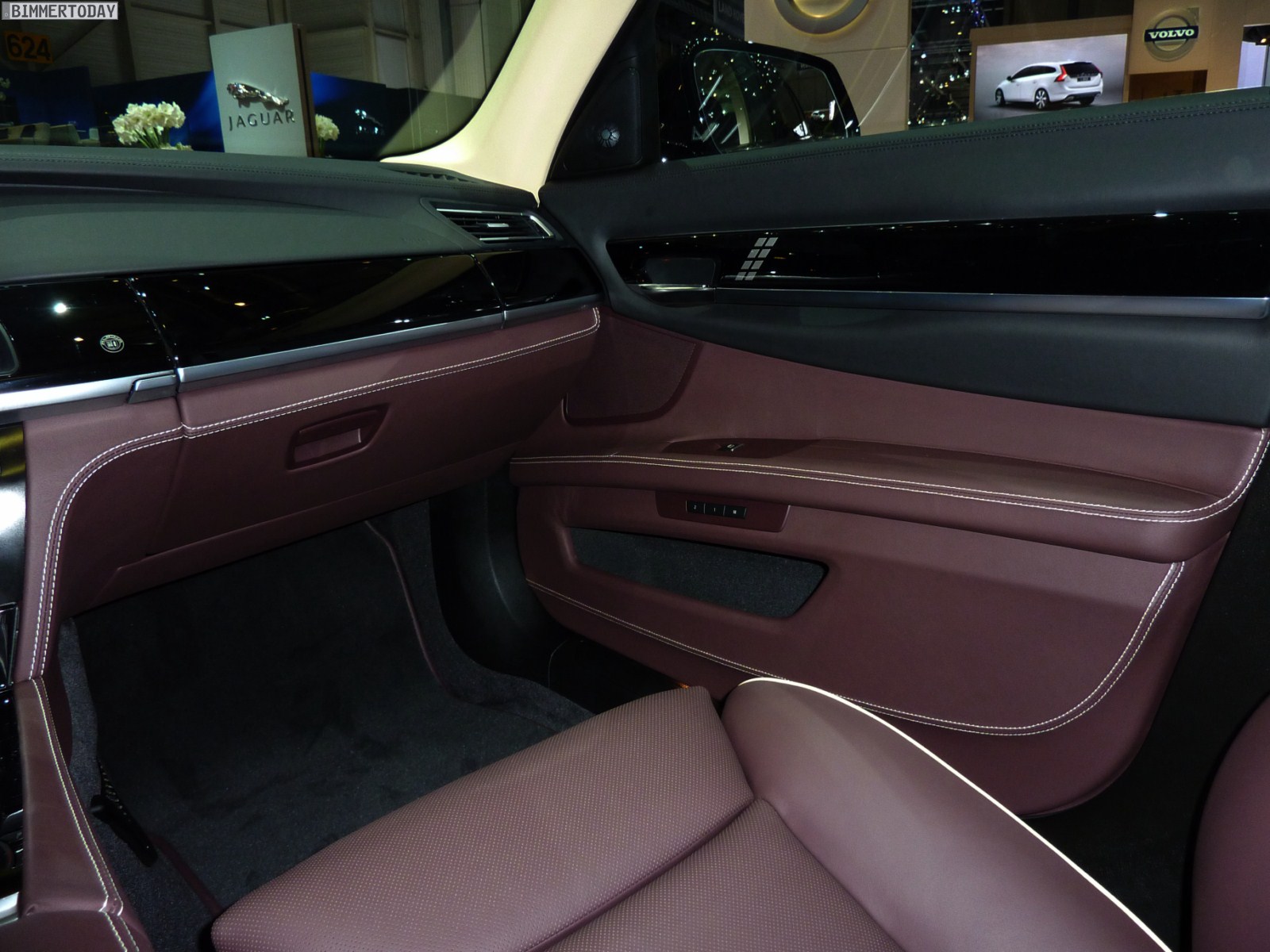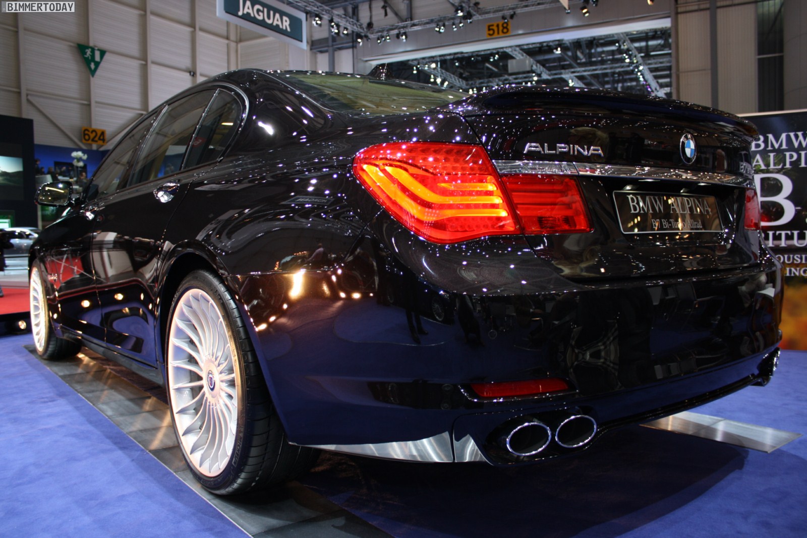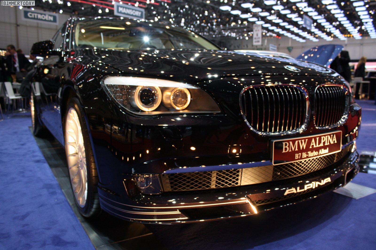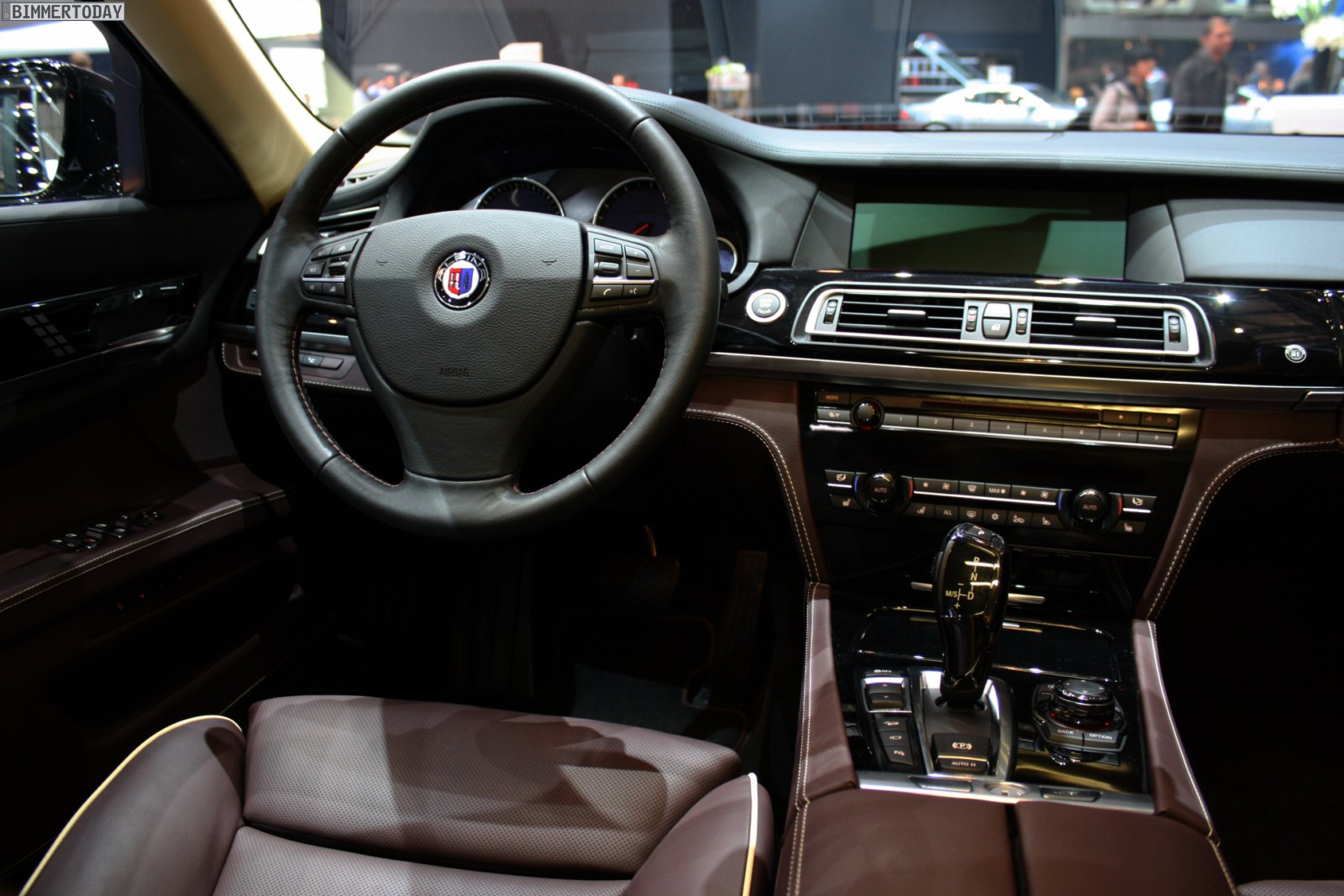Auf vielfachen Wunsch haben wir uns in Genf auch Zeit für den BMW Alpina B7 Biturbo genommen, der als Allradfahrzeug mit BMW xDrive ausgestellt war. Während B5 Limousine und Touring in Alpinablau und das B3 S Cabrio in Alpinagrün ausgestellt waren, trug die B7 Limousine keine Alpina-Lackierung. Weniger exklusiv war die Außenfarbe dennoch kaum, denn es handelt sich um die Individualfarbe Rubinschwarz Metallic, die sich durch einen dezenten rötlichen Akzent von den normalen Schwarztönen unterscheidet.