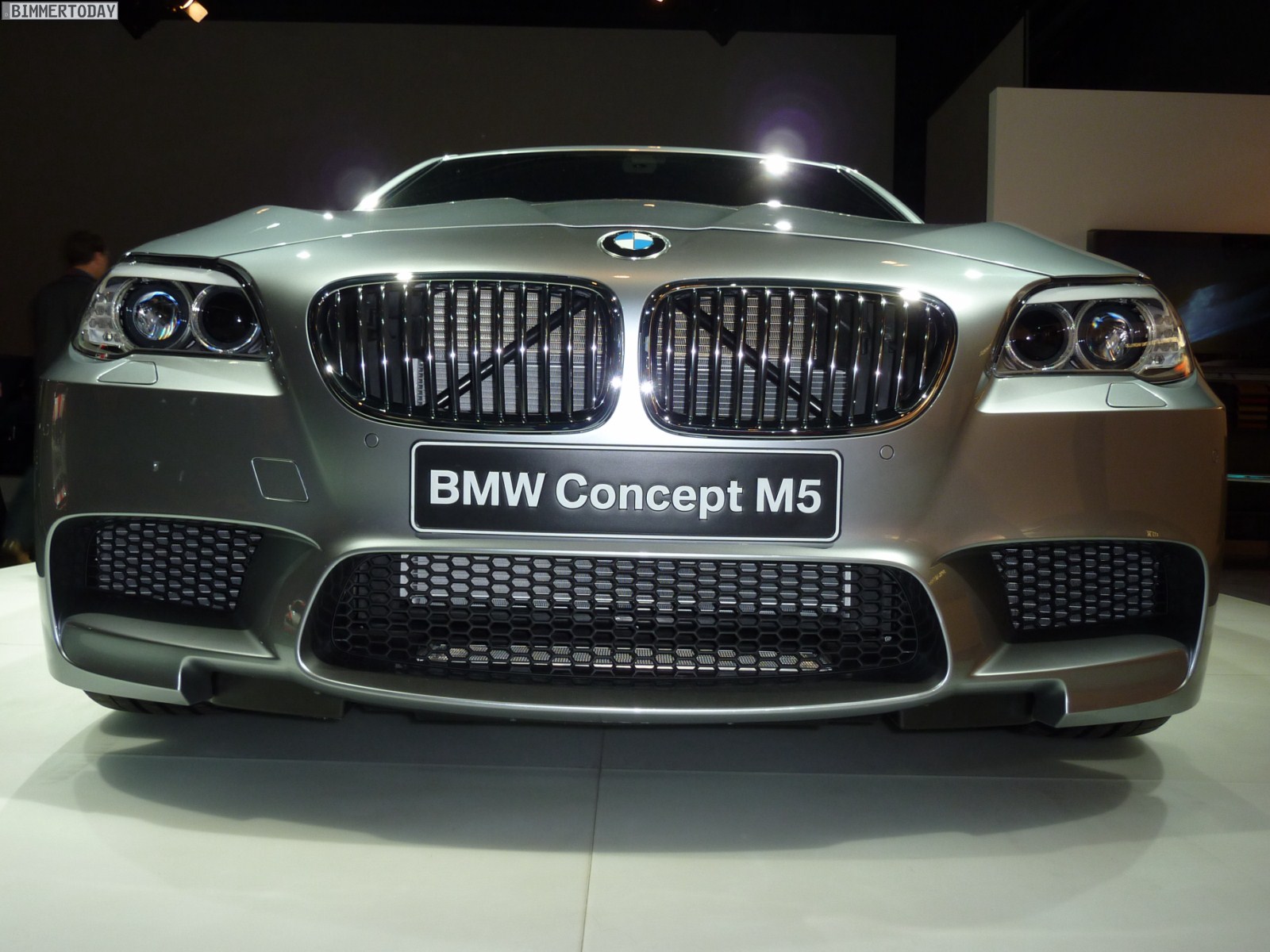 Ausrichtung des Fahrzeugs und die herausragende Kraft seines Motors. Wie bei der BMW 5er Limousine laufen auch beim BMW Concept M5 die Konturlinien der Motorhaube nach vorn hin auf die BMW Niere des Kühlergrills zu. Dynamischer Vorwärtsdrang wird auch durch die aufrechte Position der weit aufgespannten Niere signalisiert. Die im oberen Bereich von einer Akzentleuchte angeschnittenen Doppelrundscheinwerfer mit Bi-Xenon-Technologie erzeugen den auch für BMW M Automobile charakteristischen, auf die Fahrbahn fokussierten Blick.