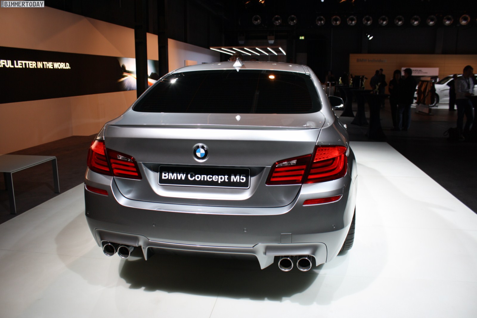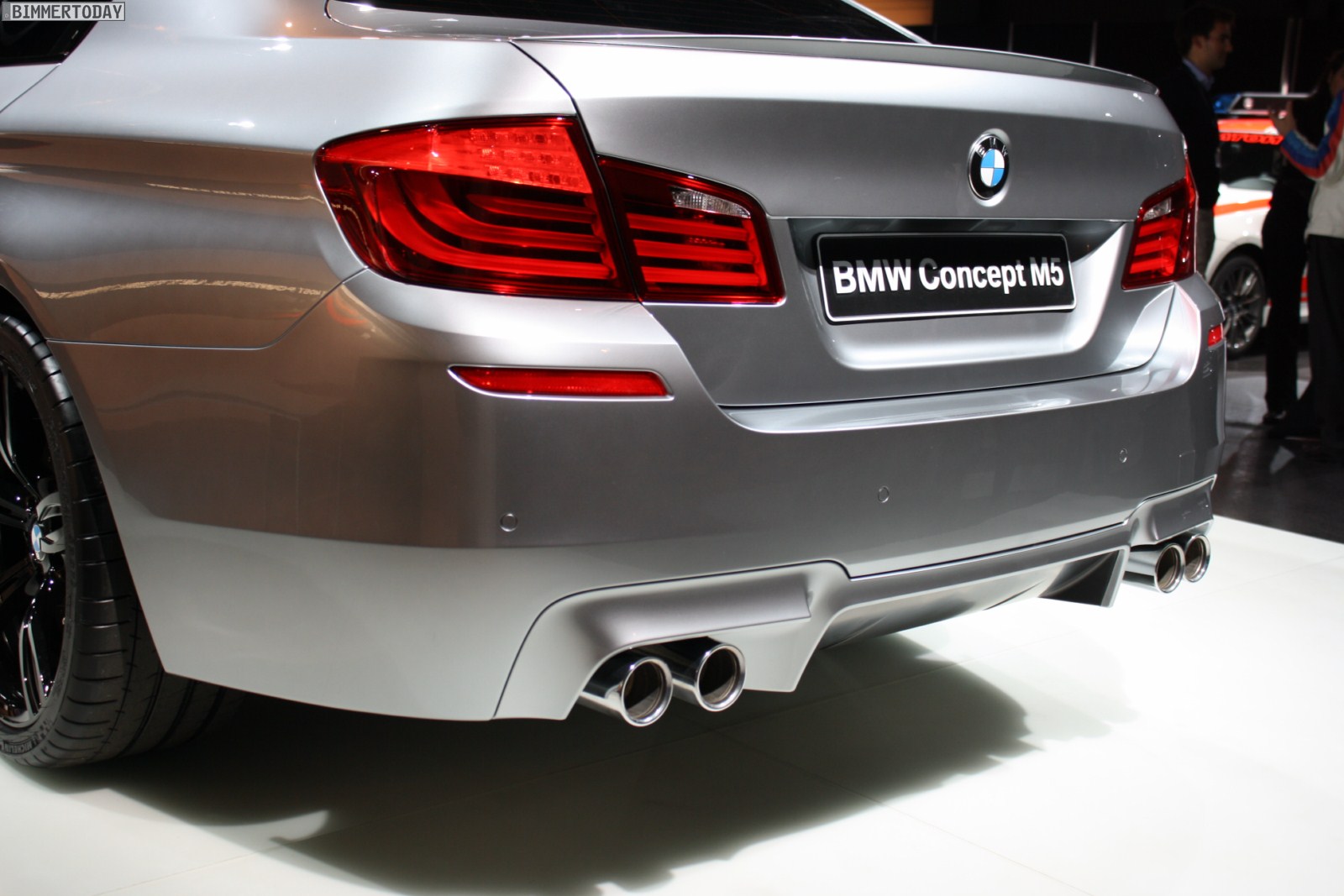Am Heck dominieren die vier Endrohre den Auftritt des Concept M5, dazwischen befindet sich wie beim Vorgänger ein angedeuteter Diffusor. Die überwiegend horizontalen Linien betonen die breite Spur des Fahrzeugs und somit den sportlichen Anspruch des BMW M5. An der Hinterachse sind 295 Millimeter breite Reifen montiert, an der Front arbeiten Reifen im Format 265 / 35 ZR20.