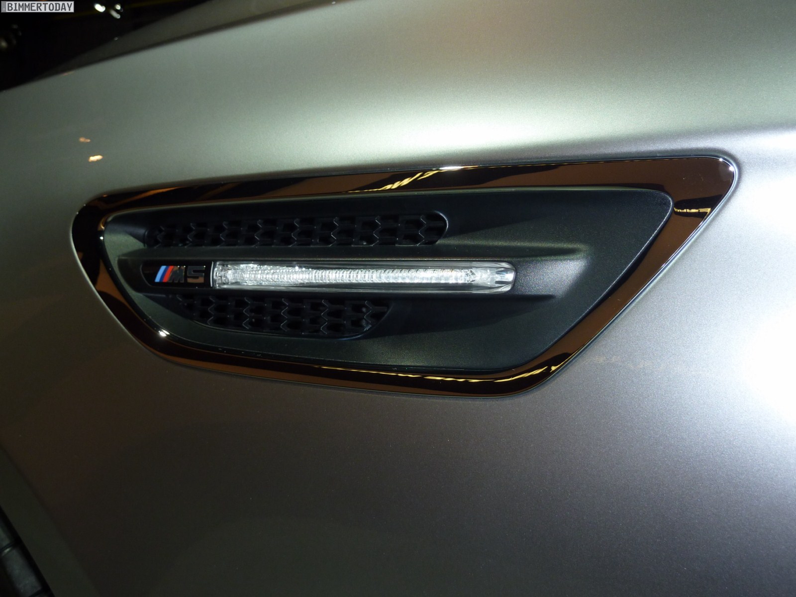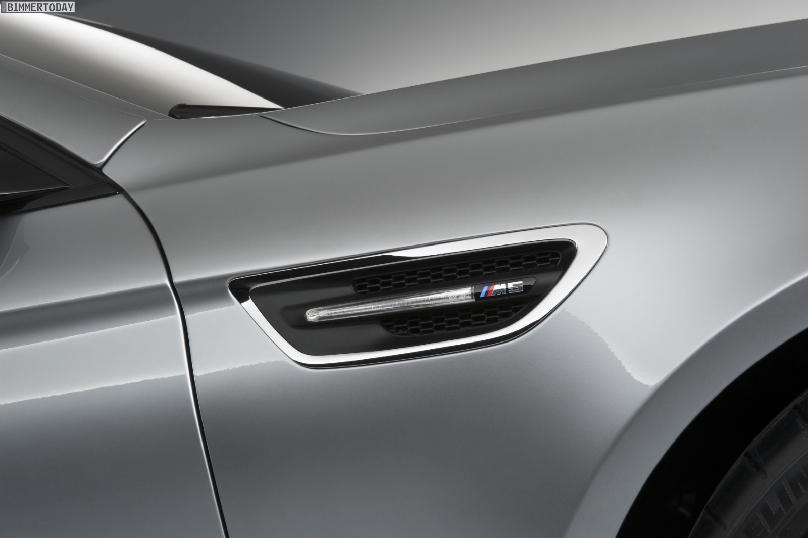 Das für M Automobile typische Kiemenelement auf der vorderen Seitenwand wird beim BMW Concept M5 in einer neuen Interpretation dargestellt. Die Kieme wird von einem hochwertigen Chromrahmen eingefasst und horizontal von einer Chromspange geteilt, die neben dem Seitenblinker auch das M Logo trägt. Das Kiemenelement ist Ausgangspunkt der Sickelinie, die sich im weiteren Verlauf über die Türöffner hinweg bis in die Heckleuchten hinein streckt.
