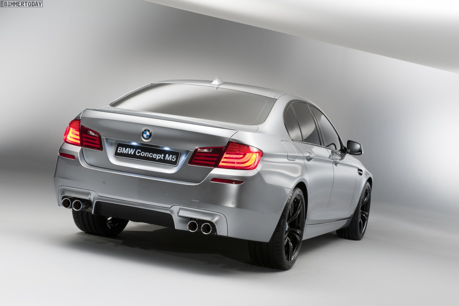Im unteren Bereich der Heckschürze bewirkt ein integrierter Diffusor eine gezielte Luftführung am Abschluss des Unterbodens. Als M typisches Erkennungsmerkmal verfügt das BMW Concept M5 über eine zweiflutige Abgasanlage, deren Doppelendrohre zu beiden Seiten des Diffusors jeweils weit außen angeordnet und von ebenfalls unter aerodynamischen Aspekten geformten Einfassungen umgeben sind. Ebenso dient der dezente Heckspoiler auf der Gepäckraumklappe zur Optimierung der Aerodynamik-Eigenschaften. Er sorgt vor allem bei hohen Geschwindigkeiten für zusätzlichen Abtrieb und trägt damit zum jederzeit souveränen Fahrverhalten der Limousine bei.