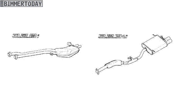 Eine unterschiedliche Dämpfungscharakteristik ergibt sich auch durch das Zusammenspiel von Dämpfervolumen, Dämpferinnenleben, Endrohrlängen und Rohrquerschnitten. So unterscheidet sich der Endschalldämpfer des 328i mit einem Volumen von etwa 20 Litern zu seinem direkten Vorgänger, dem 325i E36, optisch kaum, technisch allerdings deutlich.