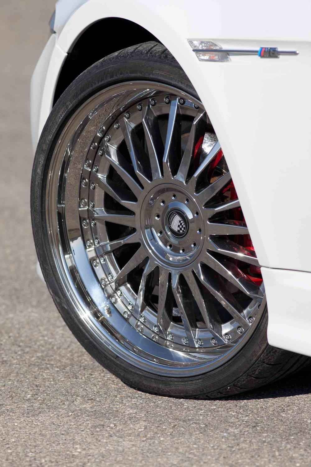 Auf den Bildern zu sehen sind außerdem Leichtmetallräder im 21 Zoll-Format, die an der Vorderachse mit 255er und an der angetriebenen Hinterachse sogar mit 295er Reifen bestückt sind.