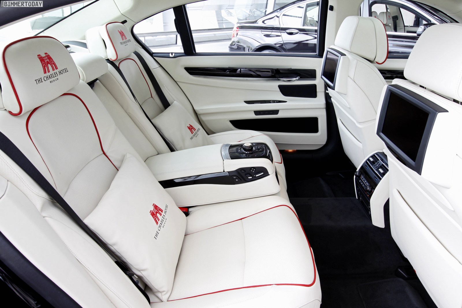 Auf den hinteren Sitzen erwarten die Gäste elektrisch einstellbare Komforteinzelsitze inklusive dem Fond-Entertainment-System Professional mit großen Displays, auf denen man beispielsweise im Internet surfen kann. Zur Bedienung kommt ein spezieller iDrive-Controller mit dem Logo der Hotelkette “Rocco Forte” zum Einsatz, zu der das “The Charles” gehört. Weitere Logos und Schriftzüge finden sich an den Rollos für Heck- und Seitenscheiben.