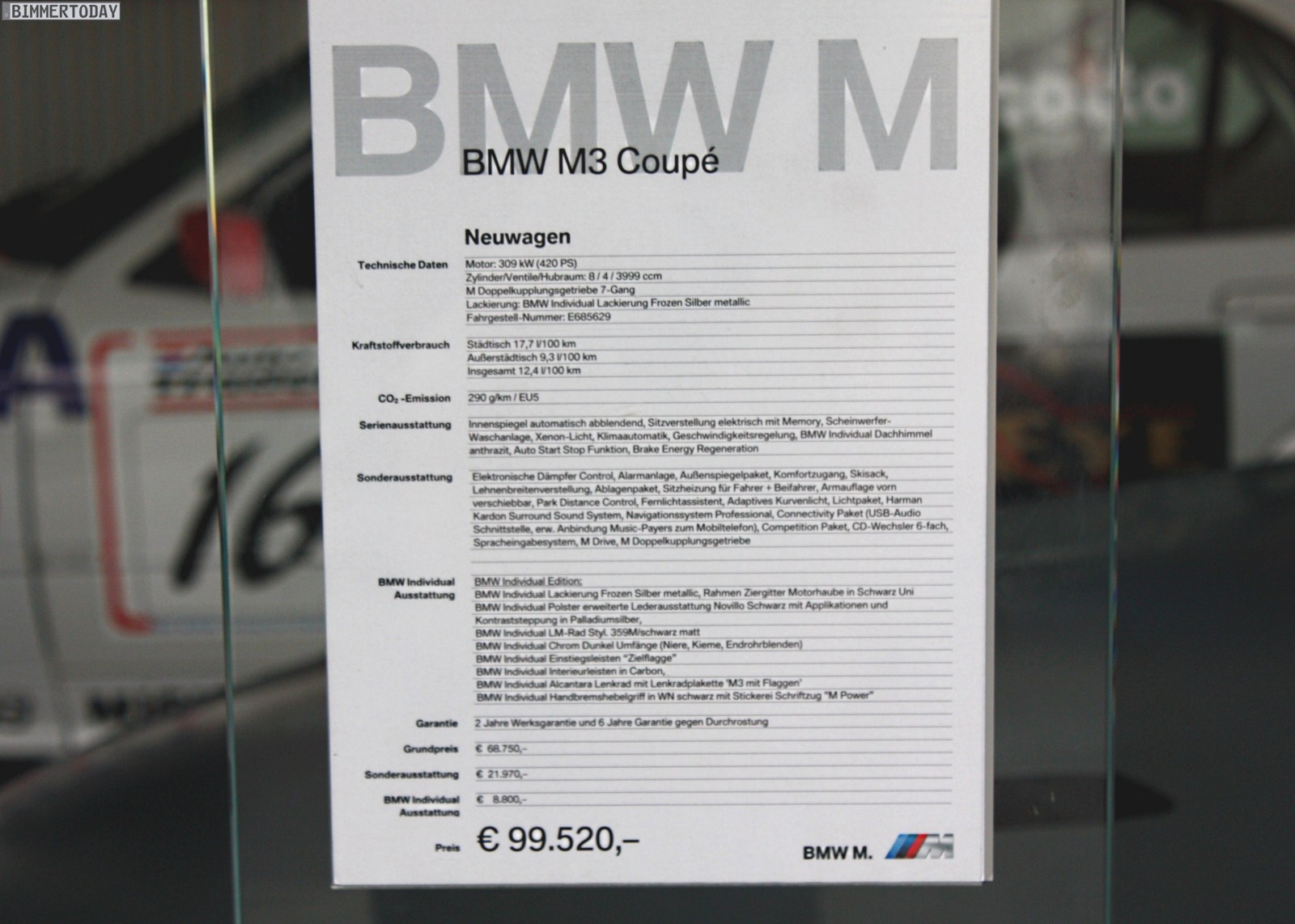 Noch exklusiver ist nur die ausschließlich für die M3 CRT Limousine angebotene Farbe Frozen Polar Silver Metallic, die etwas heller als Frozen Silver ist und angeblich nur die 67 geplanten Exemplare des M3 CRT zieren wird. Während beim CRT Akzente in Melbournerot für Abwechslung sorgen, verfügt das ausgestellte M3 Coupé über die schwarzen Felgen aus dem Competition Paket, schwarze Nieren und natürlich das serienmäßige Carbon-Dach, womit ebenfalls interessante Akzente gesetzt werden.