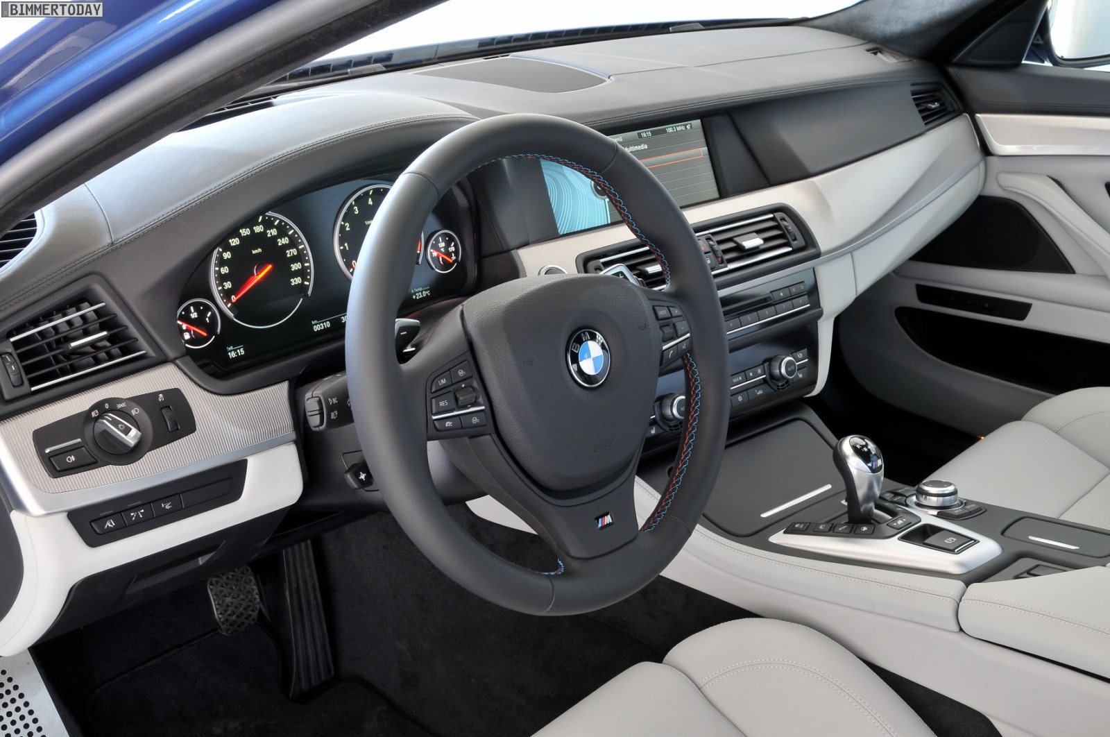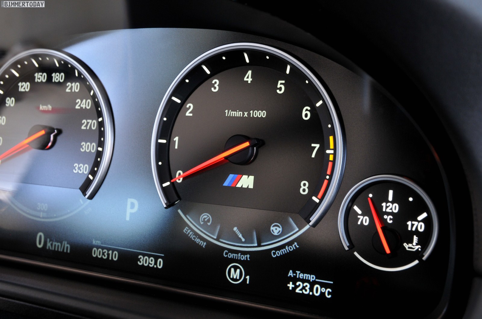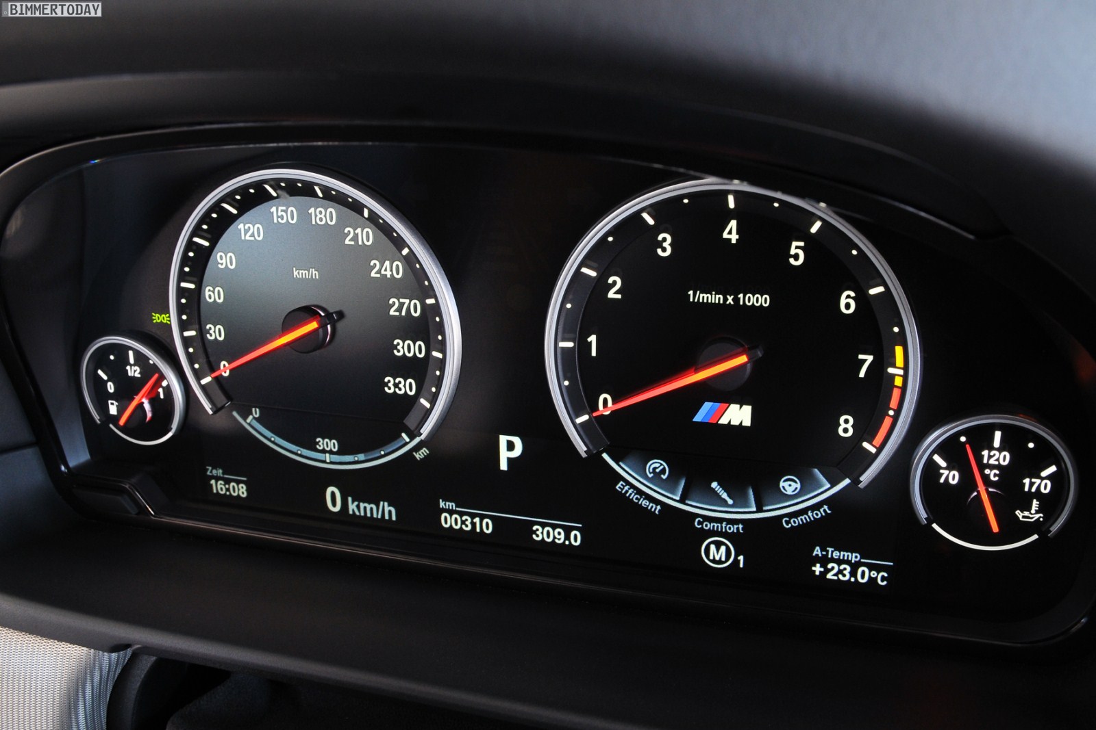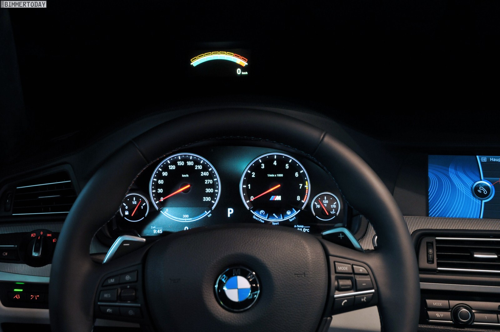 Interessanter sind insofern die neuen Bilder zu Interieur und Fahrerarbeitsplatz, denn wir sehen erstmals die neue Drehzahl-Anzeige des serienmäßigen Head-Up Displays. Der Fahrer hat die Motordrehzahl so stets im Blick und kann rechtzeitig einen Gangwechsel auslösen, falls er das Doppelkupplungsgetriebe nicht in einem der drei Automatik-Modi betreibt. Beim Vorgänger der Generation E60 hing die Anzeige im HUD stets etwas hinterher und war insofern weniger nutzbar als der echte Drehzahlmesser. Wir dürfen gespannt sein, ob BMW diese Thematik mittlerweile endgültig lösen konnte.