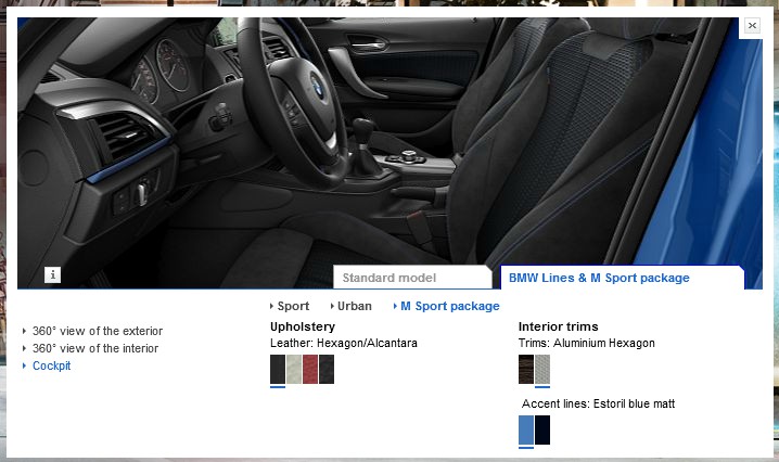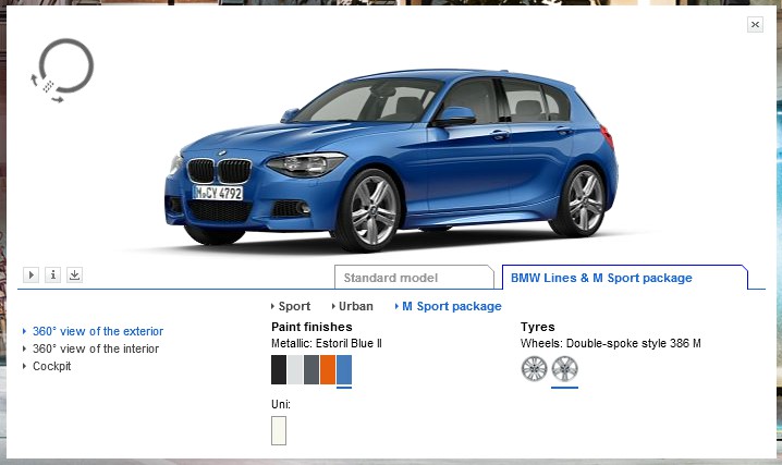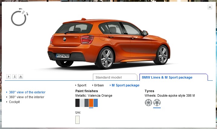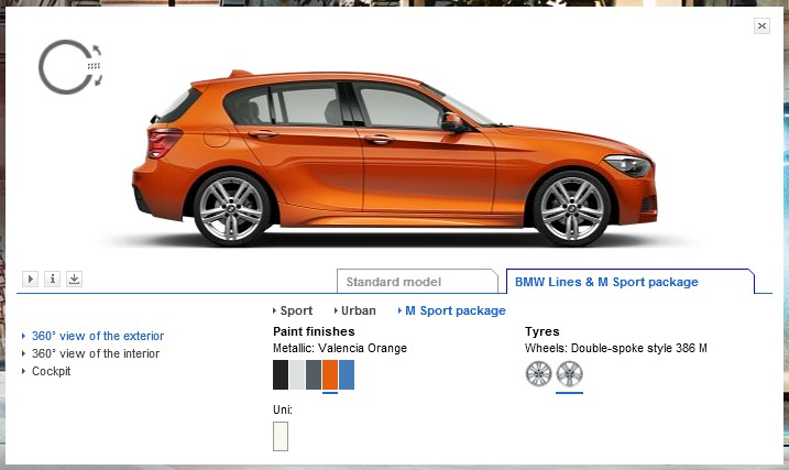 Neben der Heckpartie enthüllt der Visualizer aber auch noch andere interessante Fakten: Ausschließlich für das M Sportpaket wird es die Farbe Estorilblau Metallic geben, die den meisten Lesern bereits von diversen anderen BMW-Modellen bekannt sein dürfte und im Visualizer einen sehr guten Eindruck hinterlässt. Die Farbe Valencia Orange Metallic ist im Visualizer nur mit M Sportpaket verfügbar, wir wissen aber mit Sicherheit, dass es den vom BMW 1er M Coupé bekannten Farbton auch für Modelle mit Sport Line und Urban Line geben wird.